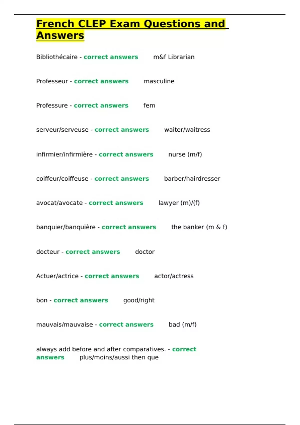 Professeur - correct answers✅✅masculine