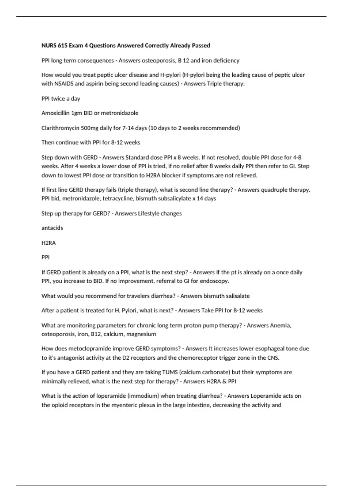NURS 615 Exam 4 Questions Answered Correctly Already Passed PPI long term consequences - Answers osteoporosis, B 12 and iron deficiency How would you treat peptic ulcer disease and H-pylori (H-pylori being the leading cause of peptic ulcer with NSAIDS and aspirin being second leading causes) - Answers Triple therapy: PPI twice a day Amoxicillin 1gm BID or metronidazole Clarithromycin 500mg daily for 7-14 days (10 days to 2 weeks recommended) Then continue with PPI for 8-12 weeks Step down with GERD - Answers Standard dose PPI x 8 weeks. If not resolved, double PPI dose for 4-8 weeks. After 4 weeks a lower dose of PPI is tried, if no relief after 8 weeks daily PPI then refer to GI. Step down to lowest PPI dose or transition to H2RA blocker if symptoms are not relieved. If first line GERD therapy fails (triple therapy), what is second line therapy? - Answers quadruple therapy. PPI bid, metronidazole, tetracycline, bismuth subsalicylate x 14 days Step up therapy for GERD? - Answers Lifestyle changes antacids H2RA PPI If GERD patient is already on a PPI, what is the next step? - Answers If the pt is already on a once daily PPI, you increase to BID. If no improvement, referral to GI for endoscopy. What would you recommend for travelers diarrhea? - Answers bismuth salisalate After a patient is treated for H. Pylori, what is next? - Answers Take PPI for 8-12 weeks What are monitoring parameters for chronic long term proton pump therapy? - Answers Anemia, osteoporosis, iron, B12, calcium, magnesium How does metoclopramide improve GERD symptoms? - Answers It increases lower esophageal tone due to it's antagonist activity at the D2 receptors and the chemoreceptor trigger zone in the CNS. If you have a GERD patient and they are taking TUMS (calcium carbonate) but their symptoms are minimally relieved, what is the next step for therapy? - Answers H2RA & PPI What is the action of loperamide (immodium) when treating diarrhea? - Answers Loperamide acts on the opioid receptors in the myenteric plexus in the large intestine, decreasing the activity and decreasing the tone of the longitudinal and circular smooth muscles of the intestinal wall. This increases the time that the material stays in the intestines, allowing more water to be absorbed from the fecal matter. It also decreases colonic mass movements in the presence of the gastric colonic reflex (the movement of food out as new food comes in stretching the stomach). What are important counseling points when administering antacids? - Answers Antacids can cause constipation when aluminum based or diarrhea when magnesium based. If a loop diuretic like furosemide is added to a patients heart failure regimen when they are already taking a cardiac glycoside like digoxin, what are important monitoring parameters? - Answers potassium, magnesium, and digitalis toxicity What are important considerations in your choice of diuretics when treating hypertension? - Answers Kidney function: Check BUN/creatinine. Also, if on thiazide, make sure GFR is higher than mid 40s. What is the primary use of tiotropium? - Answers COPD When should phenylepherine be avoided? - Answers If the patient is 4 years old or younger or has hypertension or BPH How do you treat a 3 year old with an upper respiratory infection and a cough? - Answers supportive therapy: fluids and rest