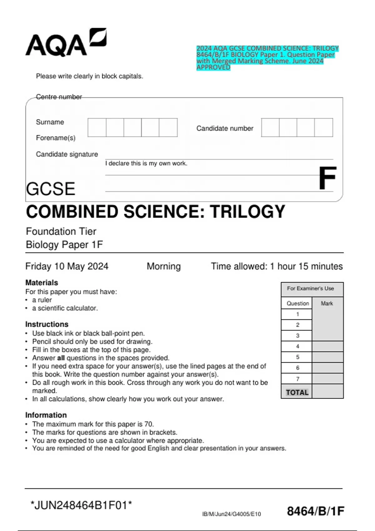 Biology Paper 1F