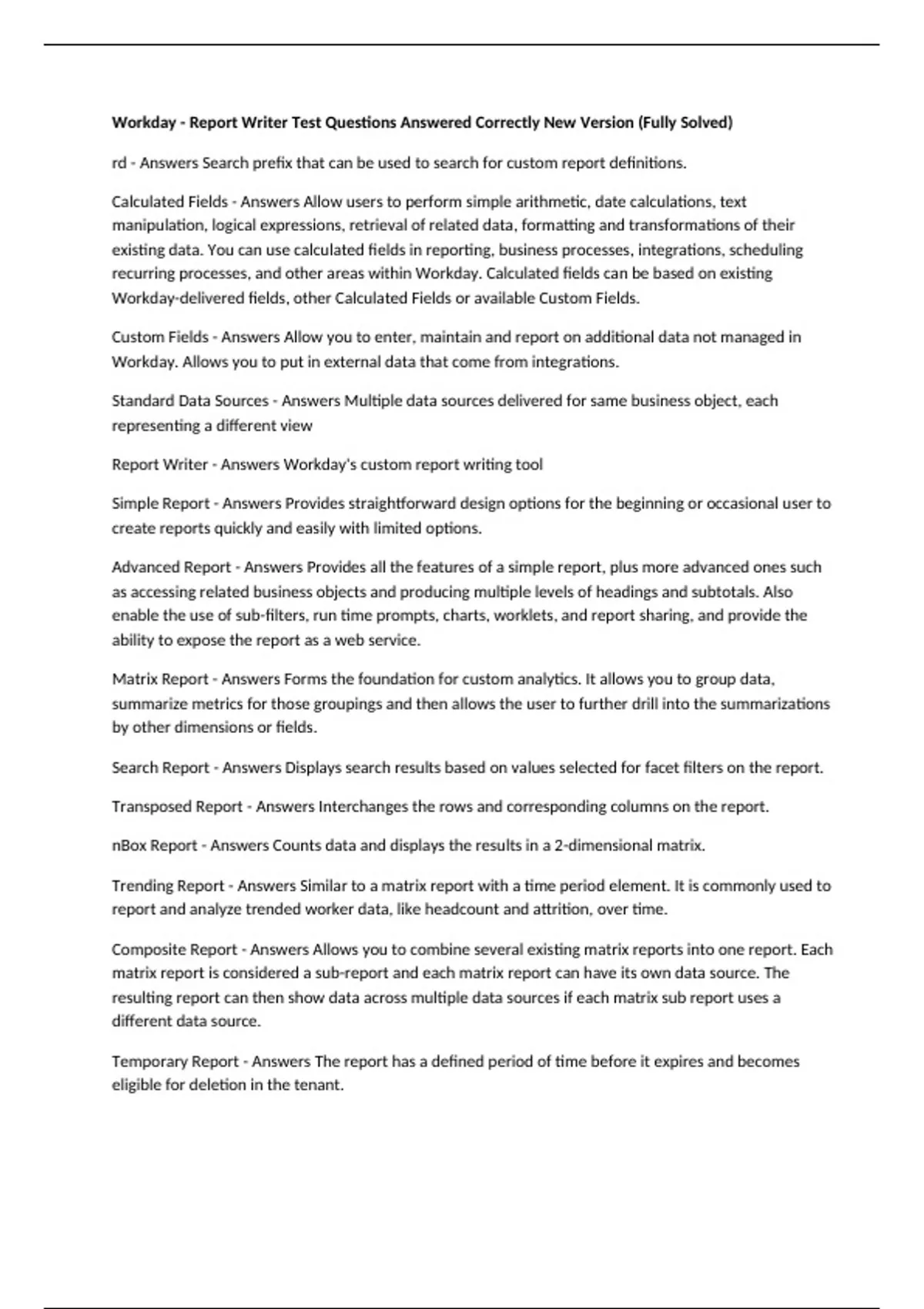 Workday - Report Writer Test Questions Answered Correctly New Version (Fully Solved) rd - Answers Search prefix that can be used to search for custom report definitions. Calculated Fields - Answers Allow users to perform simple arithmetic, date calculations, text manipulation, logical expressions, retrieval of related data, formatting and transformations of their existing data. You can use calculated fields in reporting, business processes, integrations, scheduling recurring processes, and other areas within Workday. Calculated fields can be based on existing Workday-delivered fields, other Calculated Fields or available Custom Fields. Custom Fields - Answers Allow you to enter, maintain and report on additional data not managed in Workday. Allows you to put in external data that come from integrations. Standard Data Sources - Answers Multiple data sources delivered for same business object, each representing a different view Report Writer - Answers Workday's custom report writing tool Simple Report - Answers Provides straightforward design options for the beginning or occasional user to create reports quickly and easily with limited options. Advanced Report - Answers Provides all the features of a simple report, plus more advanced ones such as accessing related business objects and producing multiple levels of headings and subtotals. Also enable the use of sub-filters, run time prompts, charts, worklets, and report sharing, and provide the ability to expose the report as a web service. Matrix Report - Answers Forms the foundation for custom analytics. It allows you to group data, summarize metrics for those groupings and then allows the user to further drill into the summarizations by other dimensions or fields. Search Report - Answers Displays search results based on values selected for facet filters on the report. Transposed Report - Answers Interchanges the rows and corresponding columns on the report. nBox Report - Answers Counts data and displays the results in a 2-dimensional matrix. Trending Report - Answers Similar to a matrix report with a time period element. It is commonly used to report and analyze trended worker data, like headcount and attrition, over time. Composite Report - Answers Allows you to combine several existing matrix reports into one report. Each matrix report is considered a sub-report and each matrix report can have its own data source. The resulting report can then show data across multiple data sources if each matrix sub report uses a different data source. Temporary Report - Answers The report has a defined period of time before it expires and becomes eligible for deletion in the tenant. Workday Standard Reports - Answers Shows all standard reports and categories, even if you do not have security permissions to access Hide Workday Delivered Reports - Answers Task to hide a Workday Delivered Report Which reports display when you run the Workday Standard Reports report? - Answers All Workday-delivered reports, regardless of access. What report data manipulation can you only make when editing a report definition? - Answers Add or remove columns Which feature lets you easily search for custom reports? - Answers Report Tags What does your data source selection determine for a report? - Answers PBO, starting dataset, which users you can share the report with Which type of class report field displays all expense lines for an expense report? - Answers Multi-Instance When creating a custom report, which information is optional to specify? - Answers Sort Order When Workday applies report filters, which logic does it execute first? - Answers Subfilter You need to filter a custom report to only show regular employees. Which comparison type should you use when creating the filter? - Answers Value specified in this filter A custom report has a prompt for Include Subordinate Organizations. How can you set the prompt value to always be yes and hide this prompt from users? - Answers Select Specify Default Value and identify the default selection Select the Do Not Prompt at Runtime checkbox Which of the following is a source of prompts on a report? - Answers Data Source Filter Data Source When totaling data on a report, how many aggregations can you select per row? - Answers One What is the first step of setting up grouping in your report? - Answers Add the Group Name field to the top of the columns grid You can create a custom report if you have access to what security domain? - Answers Custom Report Creation A user gets the following error message when running a report: "Attempt to run a report where you do not have access to one or more fields referenced in the report's filter. Fields: Age. filter." What is the root cause of this issue? - Answers The user does not belong to a security group that has access to a report field used in a filter. An HR partner runs an employee report that includes the Citizenship Status field. She can see the Citizenship Status for some employees on the report but not all. Why can she not see