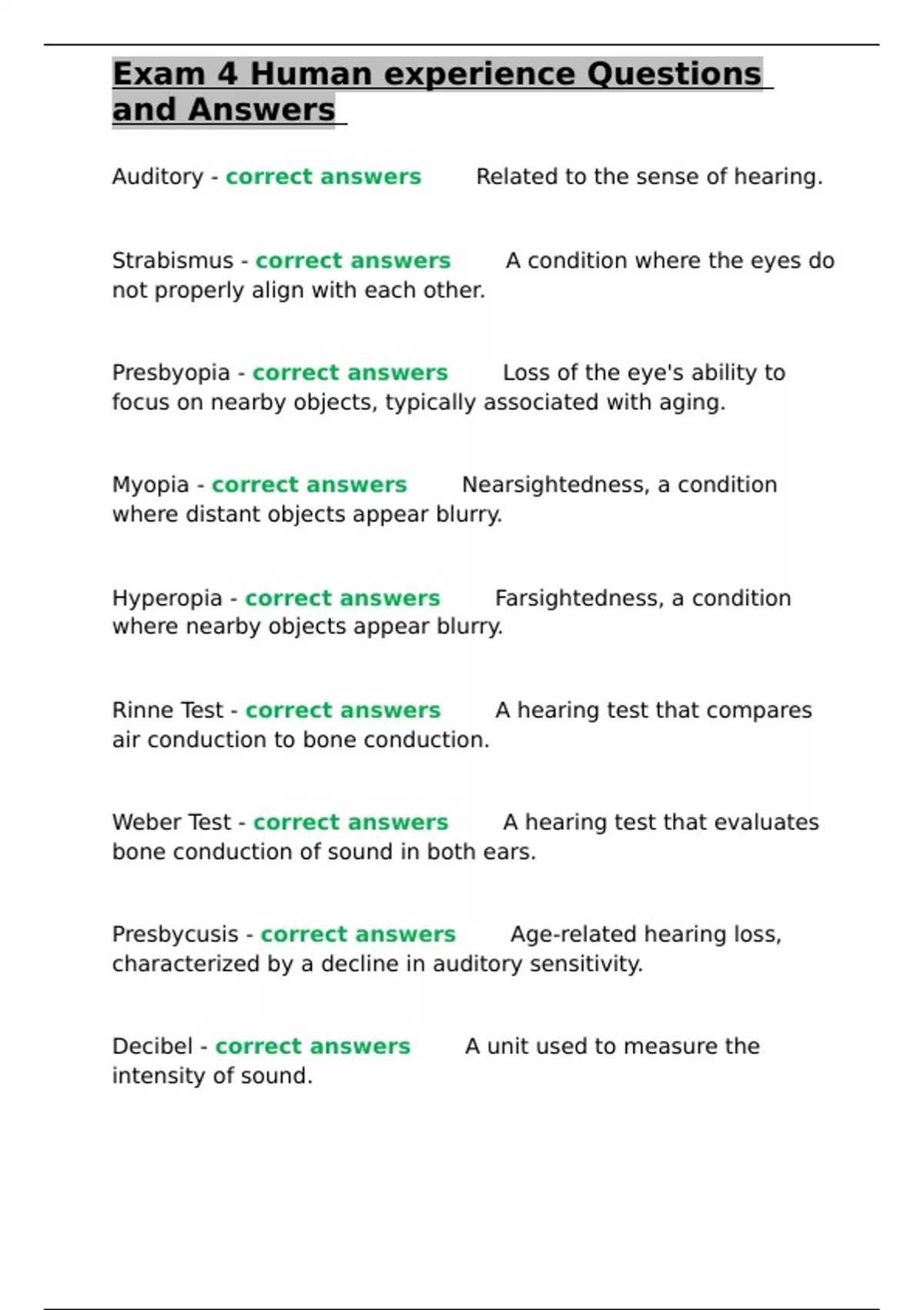 Auditory - correct answers✅✅Related to the sense of hearing.