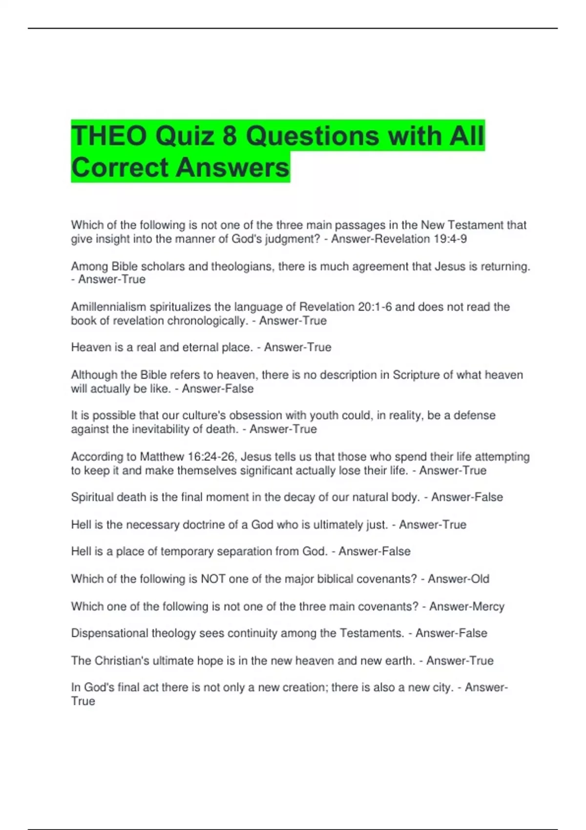 THEO Quiz 8 Questions with All Correct Answers Which of the following is not one of the three main passages in the New Testament that give insight into the manner of God's judgment? - Answer-Revelation 19:4-9 Among Bible scholars and theologians, there is much agreement that Jesus is returning. - Answer-True Amillennialism spiritualizes the language of Revelation 20:1-6 and does not read the book of revelation chronologically. - Answer-True Heaven is a real and eternal place. - Answer-True Although the Bible refers to heaven, there is no description in Scripture of what heaven will actually be like. - Answer-False It is possible that our culture's obsession with youth could, in reality, be a defense against the inevitability of death. - Answer-True According to Matthew 16:24-26, Jesus tells us that those who spend their life attempting to keep it and make themselves significant actually lose their life. - Answer-True Spiritual death is the final moment in the decay of our natural body. - Answer-False Hell is the necessary doctrine of a God who is ultimately just. - Answer-True Hell is a place of temporary separation from God. - Answer-False Which of the following is NOT one of the major biblical covenants? - Answer-Old Which one of the following is not one of the three main covenants? - Answer-Mercy Dispensational theology sees continuity among the Testaments. - Answer-False The Christian's ultimate hope is in the new heaven and new earth. - Answer-True