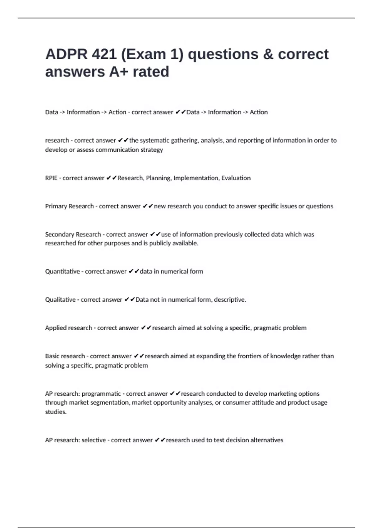 Applied research - correct answer ✔✔research aimed at solving a specific, pragmatic problem