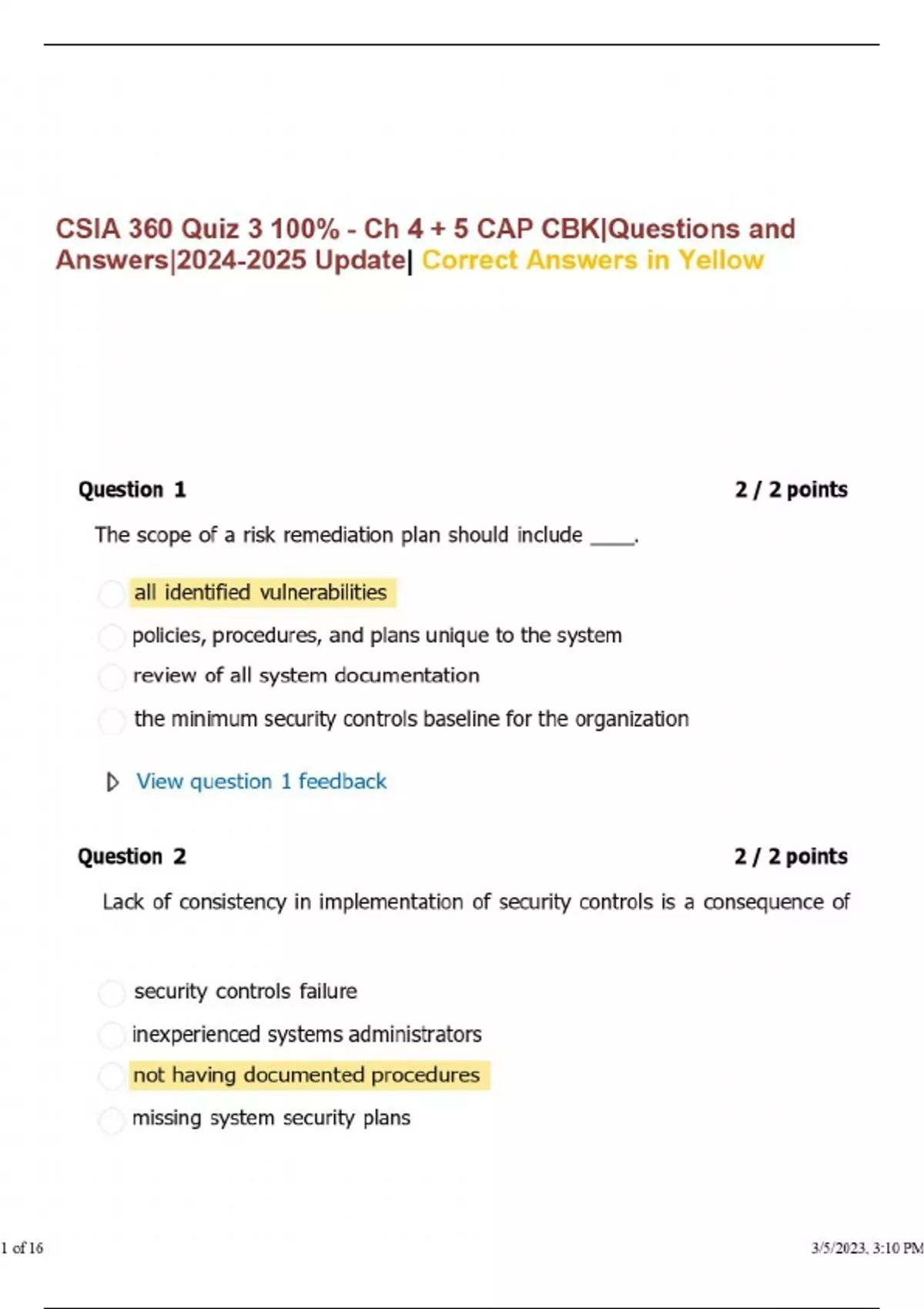 CSIA 360 Quiz 3 100% - Ch 4 + 5 CAP CBK|Questions and Answers| Update| Correct Answers in Yellow