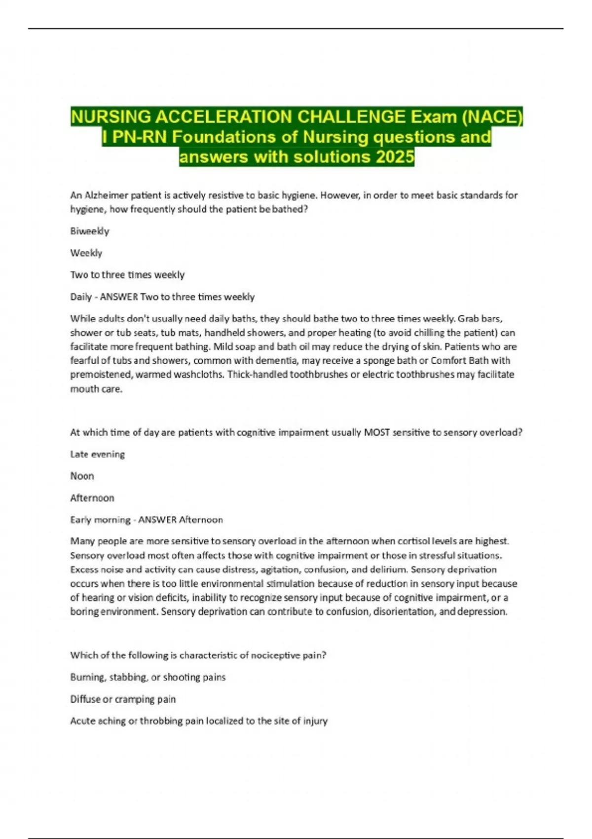 An Alzheimer patient is actively resistive to basic hygiene. However, in order to meet basic standards for hygiene, how frequently should the patient be bathed? Biweekly Weekly Two to three times weekly Daily - ANSWER Two to three times weekly While adults don't usually need daily baths, they should bathe two to three times weekly. Grab bars, shower or tub seats, tub mats, handheld showers, and proper heating (to avoid chilling the patient) can facilitate more frequent bathing. Mild soap and bath oil may reduce the drying of skin. Patients who are fearful of tubs and showers, common with dementia, may receive a sponge bath or Comfort Bath with premoistened, warmed washcloths. Thick-handled toothbrushes or electric toothbrushes may facilitate mouth care. At which time of day are patients with cognitive impairment usually MOST sensitive to sensory overload? Late evening Noon Afternoon Early morning - ANSWER Afternoon Many people are more sensitive to sensory overload in the afternoon when cortisol levels are highest. Sensory overload most often affects those with cognitive impairment or those in stressful situations. Excess noise and activity can cause distress, agitation, confusion, and delirium. Sensory deprivation occurs when there is too little environmental stimulation because of reduction in sensory input because of hearing or vision deficits, inability to recognize sensory input because of cognitive impairment, or a boring environment. Sensory deprivation can contribute to confusion, disorientation, and depression. Which of the following is characteristic of nociceptive pain? Burning, stabbing, or shooting pains Diffuse or cramping pain Acute aching or throbbing pain localized to the site of injury Association with chronic condit