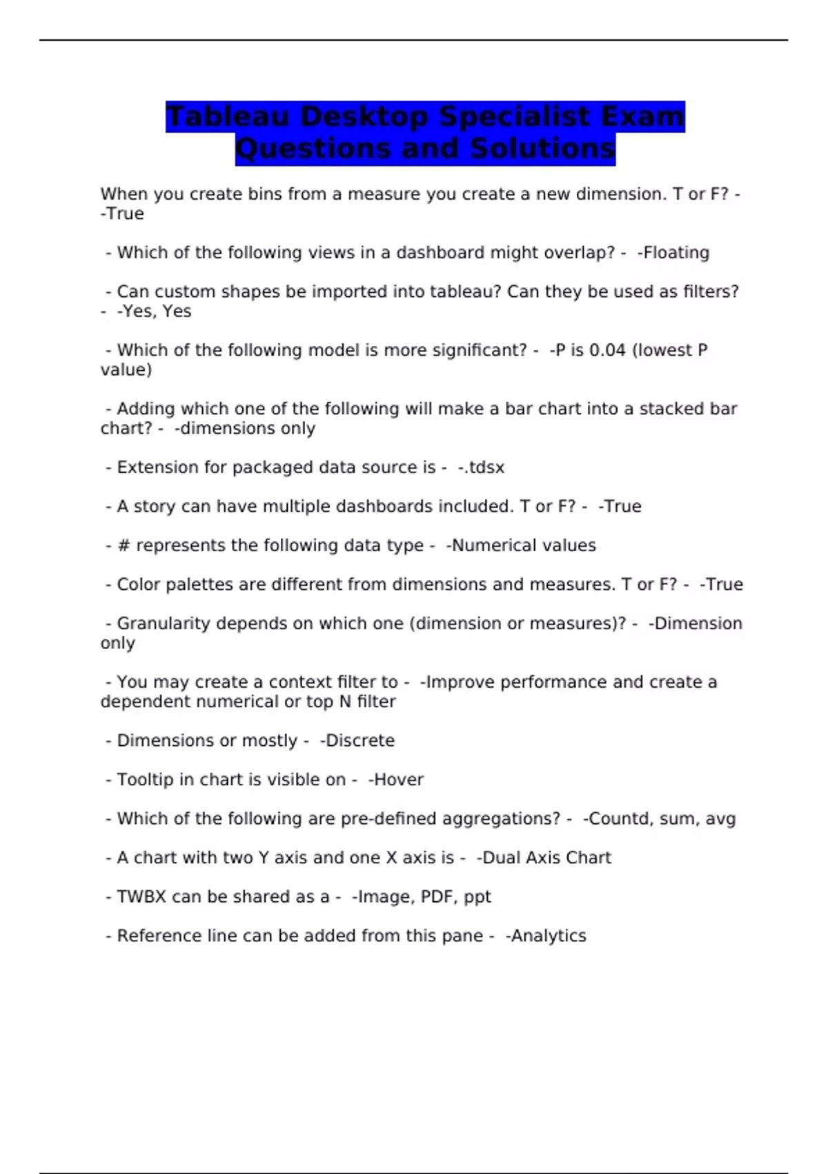 Tableau Desktop Specialist Exam Questions and Solutions