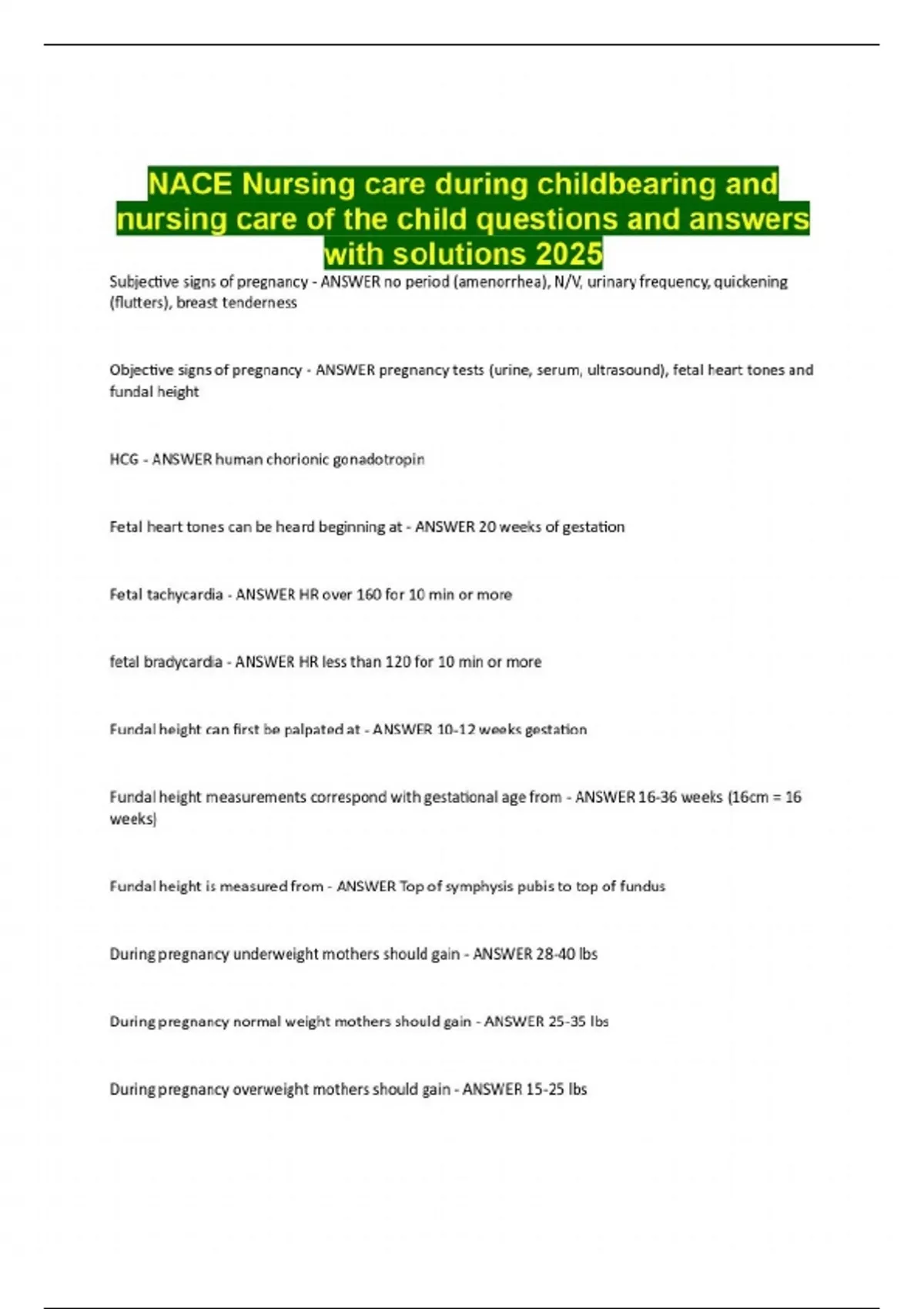 NACE Nursing care during childbearing and nursing care of the child questions and answers with solutions 2025
