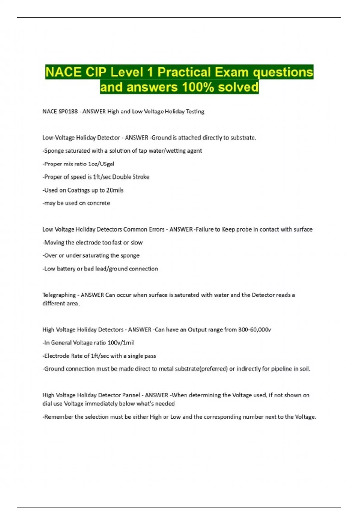 NACE SP0188 - ANSWER High and Low Voltage Holiday Testing Low-Voltage Holiday Detector - ANSWER -Ground is attached directly to substrate. -Sponge saturated with a solution of tap water/wetting agent -Proper mix ratio 1oz/USgal -Proper of speed is 1ft/sec Double Stroke -Used on Coatings up to 20mils -may be used on concrete Low Voltage Holiday Detectors Common Errors - ANSWER -Failure to Keep probe in contact with surface -Moving the electrode too fast or slow -Over or under saturating the sponge -Low battery or bad lead/ground connection Telegraphing - ANSWER Can occur when surface is saturated with water and the Detector reads a different area. High Voltage Holiday Detectors - ANSWER -Can have an Output range from 800-60,000v -In General Voltage ratio 100v/1mil -Electrode Rate of 1ft/sec with a single pass -Ground connection must be made direct to metal substrate(preferred) or indirectly for pipeline in soil. High Voltage Holiday Detector Pannel - ANSWER -When determining the Voltage used, if not shown on dial use Voltage immediately below what's needed -Remember the selection must be either High or Low and the corresponding number next to the Voltage. SSPC-PA2 - ANSWER Dry Film Thickness Gauge SSPC-PA2 Type 1 - ANSWER Magnetic Pull-Off DFT Gauge -Dial-Type Magnetic Pull-Off DFT Gauge (Banana Gauge) -Pencil Type Magnetic Pull-Off DFT Gauge Dial TypeMagnetic Pull-Off DFT Gauge - ANSWER -Known as "Banana Gauge" -Intrinsically Safe -Some Models Can Be Used Underwater