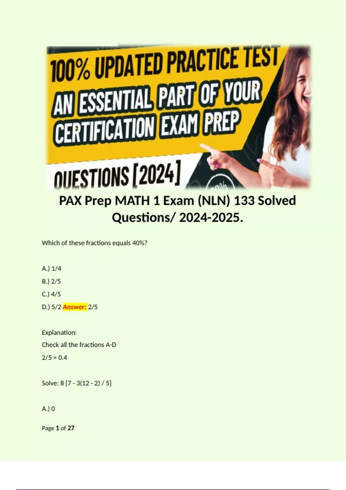 PAX Prep MATH 1 Exam (NLN) 133 Solved Questions/ . Which of these fractions equals 40%? A.) 1/4 B.) 2/5 C.) 4/5 D.) 5/2 Answer: 2/5 Explanation: Check all the fractions A-D 2/5 = 0.4 Solve: 8 [7 - 3(12 - 2) / 5] A.) 0 B.) 8 C.) 16 D.) 64 Answer: 8 Factor 6x^2 + x -12 in two binomial terms. A.) (2x - 4)(3x + 3) B.) x(6x + 1) - 12 C.) (3x + 4)(2x - 3) D.) (2x + 3)(3x -4) Answer: (2x + 3)(3x - 4) 17 out of 25 children in a pediatrics ward are under 1 year old. Express this fraction as a percentage. A.) 0.17% B.) 0.68% C.) 17.25% D.) 68% Answer: 68% A nursing home allows its residents to be admitted with their pets. Last month, 8 of the 25 residents had their pets with them. What percentage of the residents is this? A.) 30% B.) 32% C.) 35% D.) 40% Answer: 32%