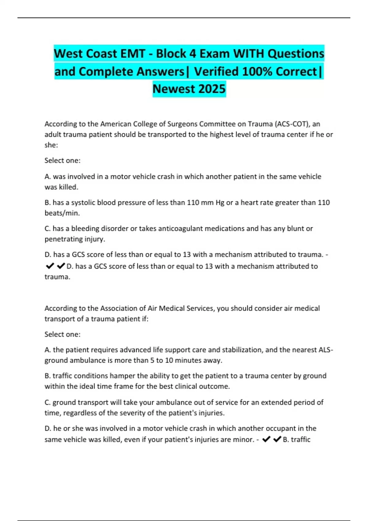 West Coast EMT - Block 4 Exam WITH Questions and Complete Answers| Verified 100% Correct| Newest 2025