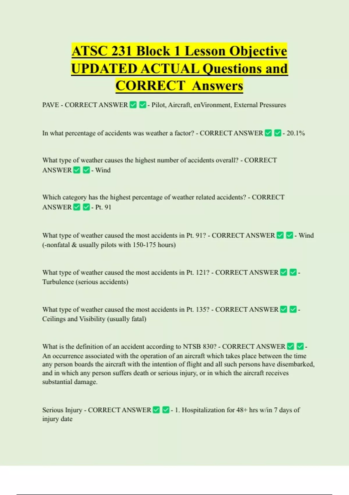 ATSC 231 Block 1 Lesson Objective UPDATED ACTUAL Questions and CORRECT Answers PAVE - CORRECT ANSWER - Pilot, Aircraft, enVironment, External Pressures In what percentage of accidents was weather a factor? - CORRECT ANSWER - 20.1% What type of weather causes the highest number of accidents overall? - CORRECT ANSWER - Win