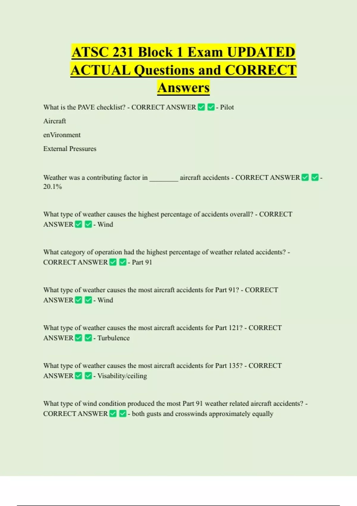 ATSC 231 Block 1 Exam UPDATED ACTUAL Questions and CORRECT Answers What is the PAVE checklist? - CORRECT ANSWER - Pilot Aircraft enVironment External Pressures Weather was a contributing factor in ________ aircraft accidents - CORRECT ANSWER - 20.1%