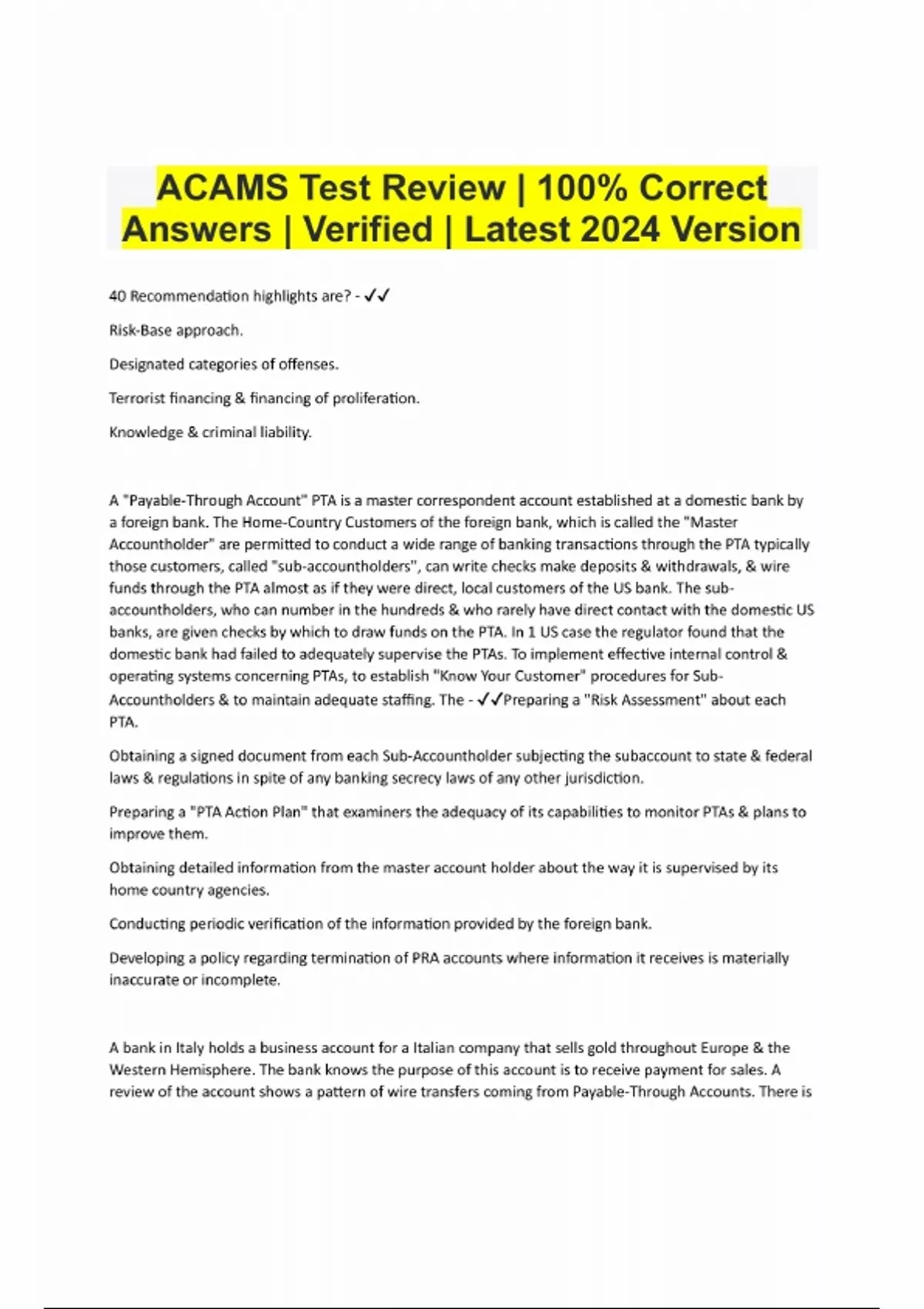 ACAMS Test Review | 100% Correct Answers | Verified | Latest 2024 Version