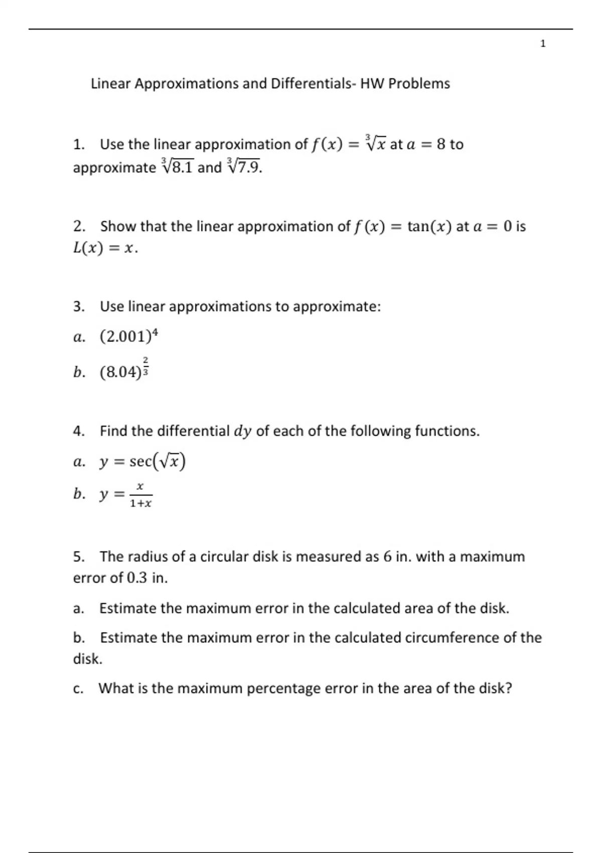 Linear Approximations and Differentials- HW Problems