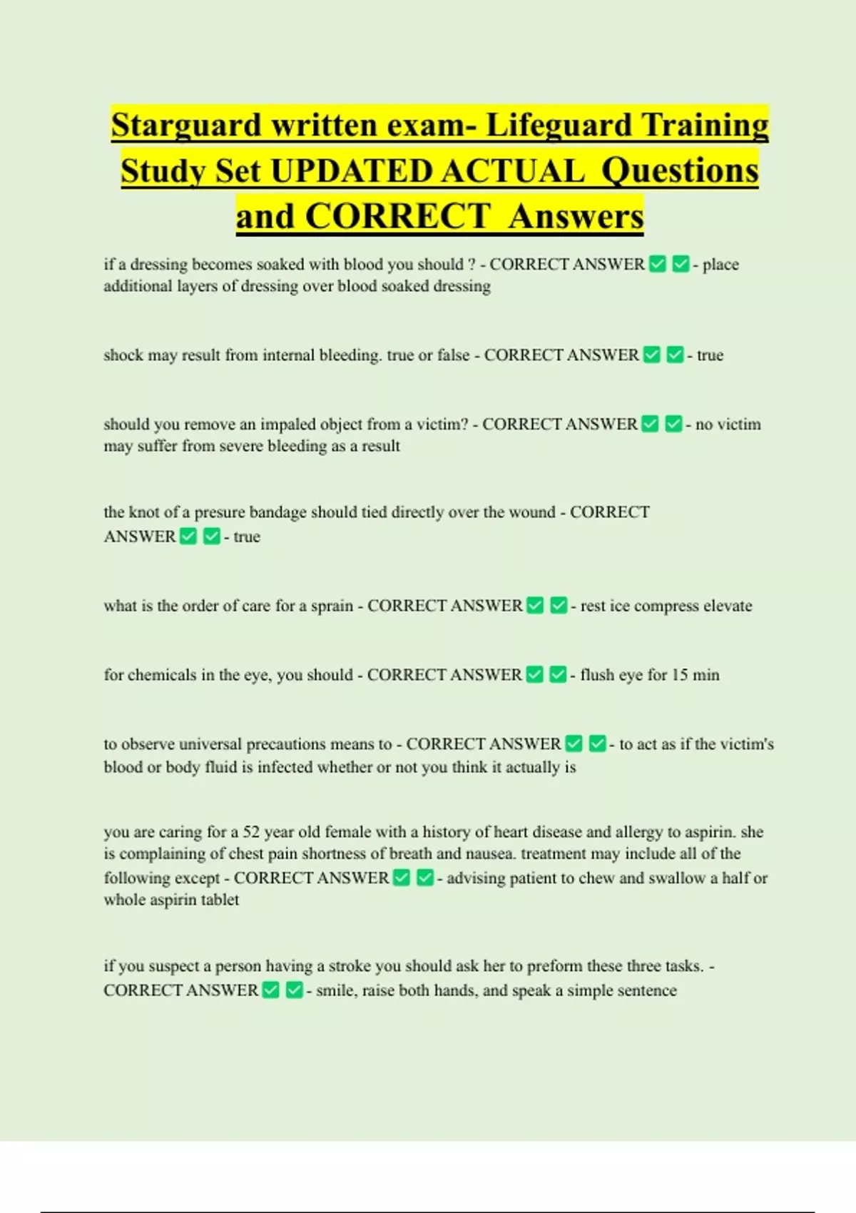 Starguard written exam- Lifeguard Training Study Set UPDATED ACTUAL Questions and CORRECT Answers