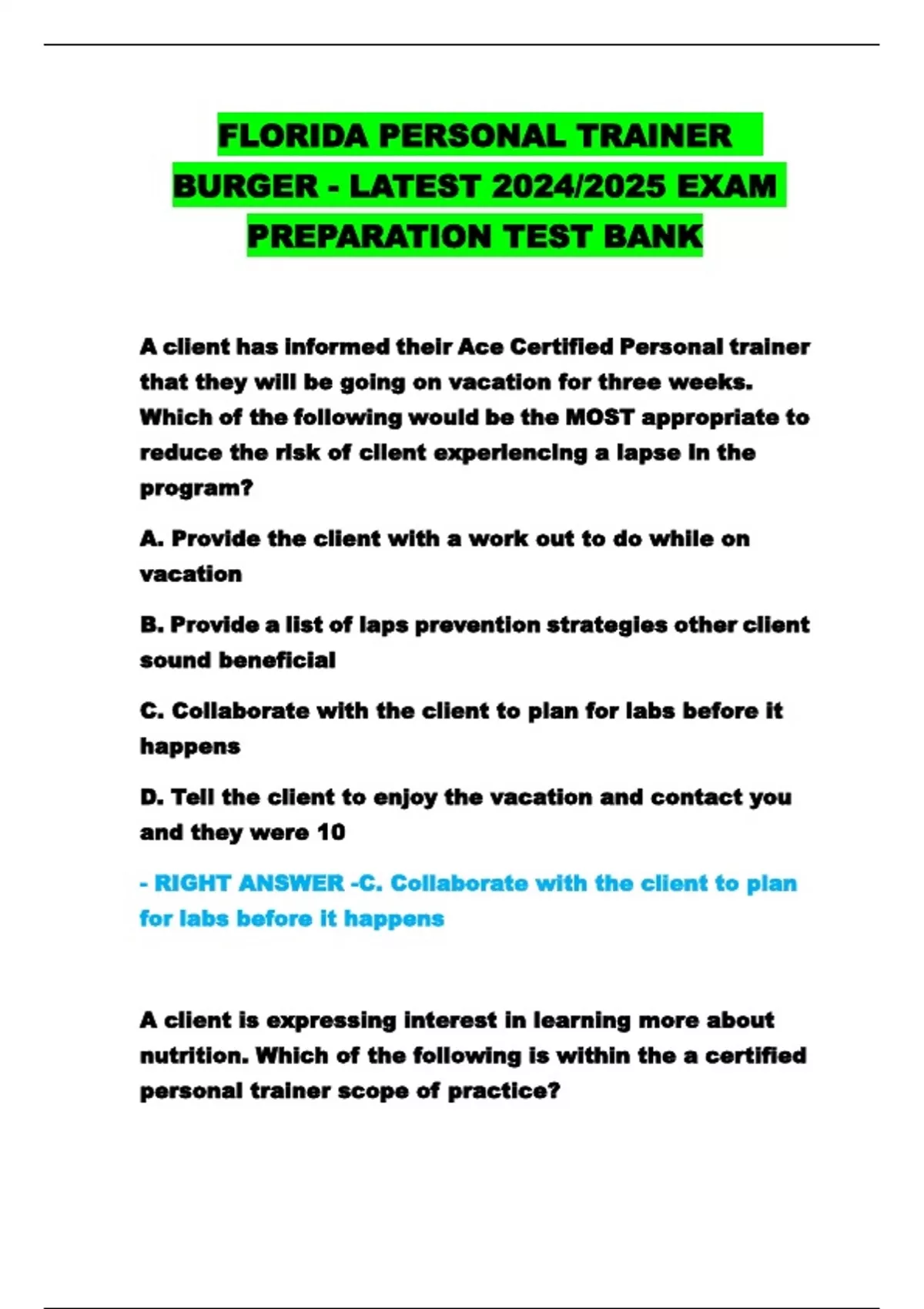 FLORIDA PERSONAL TRAINER BURGER - LATEST 2024/2025 EXAM PREPARATION TEST BANK WITH QUESTIONS AND VERIFIED ANSWERS
