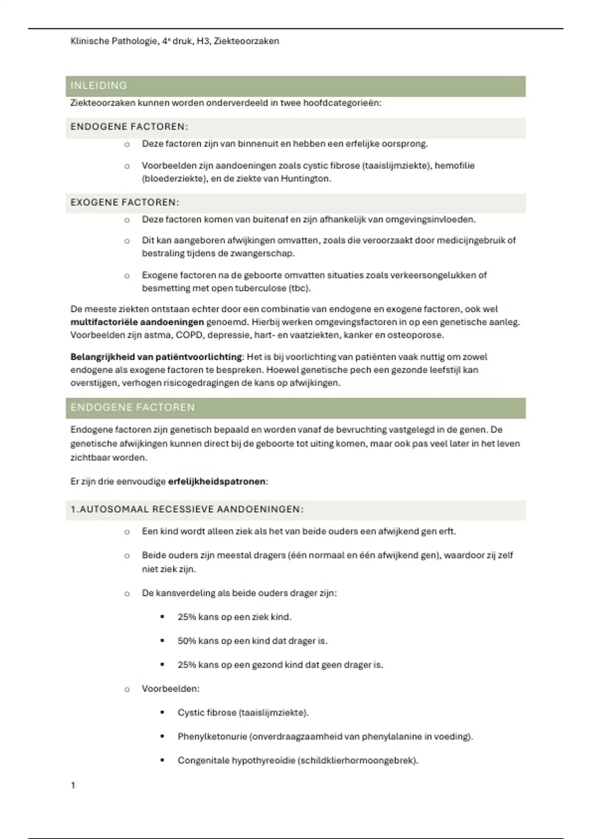 Uitgebreide samenvatting uit het boek Klinische Pathologie, 4e druk, Hoofdstuk 3 (H3). Onderwerpen die behandeld worden zijn: -Ziekteoorzaken -Endogene factoren -Exogene factoren -Multifactoriële aandoeningen