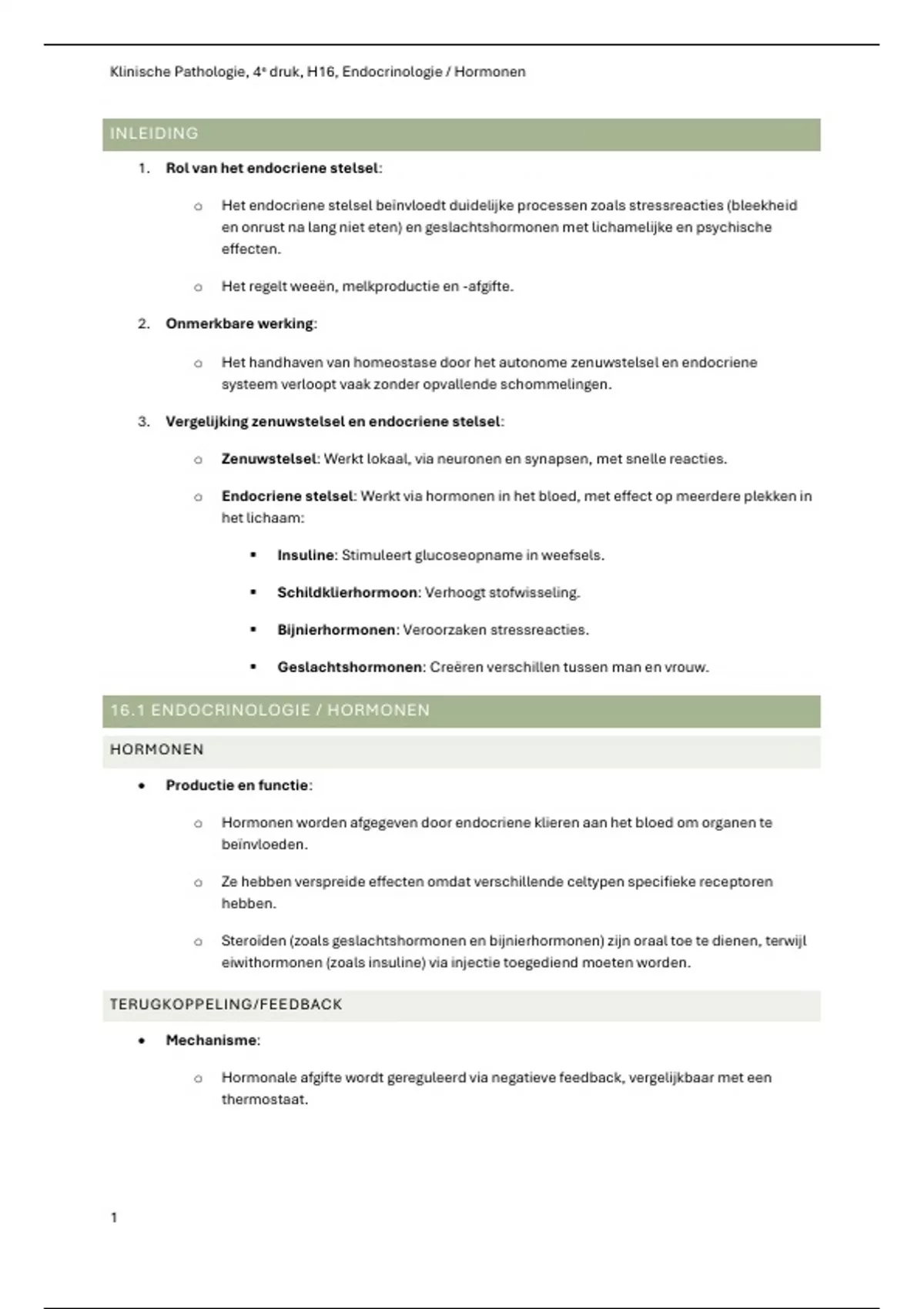 Uitgebreide samenvatting uit het boek Klinische Pathologie, 4e druk, Hoofdstuk 16 (H16). Onderwerpen die behandeld worden zijn: -Hormonen -Diabetes -Schildklierafwijkingen -Bijnierafwijkingen De samenvatting gaat in op risicofactoren, verschijnselen, oorzaken, behandeling.
