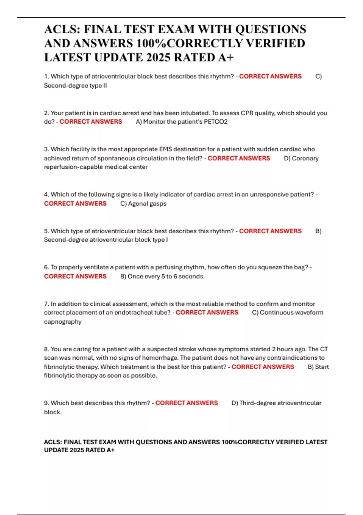 ACLS: FINAL TEST EXAM WITH QUESTIONS AND ANSWERS 100%CORRECTLY VERIFIED LATEST
