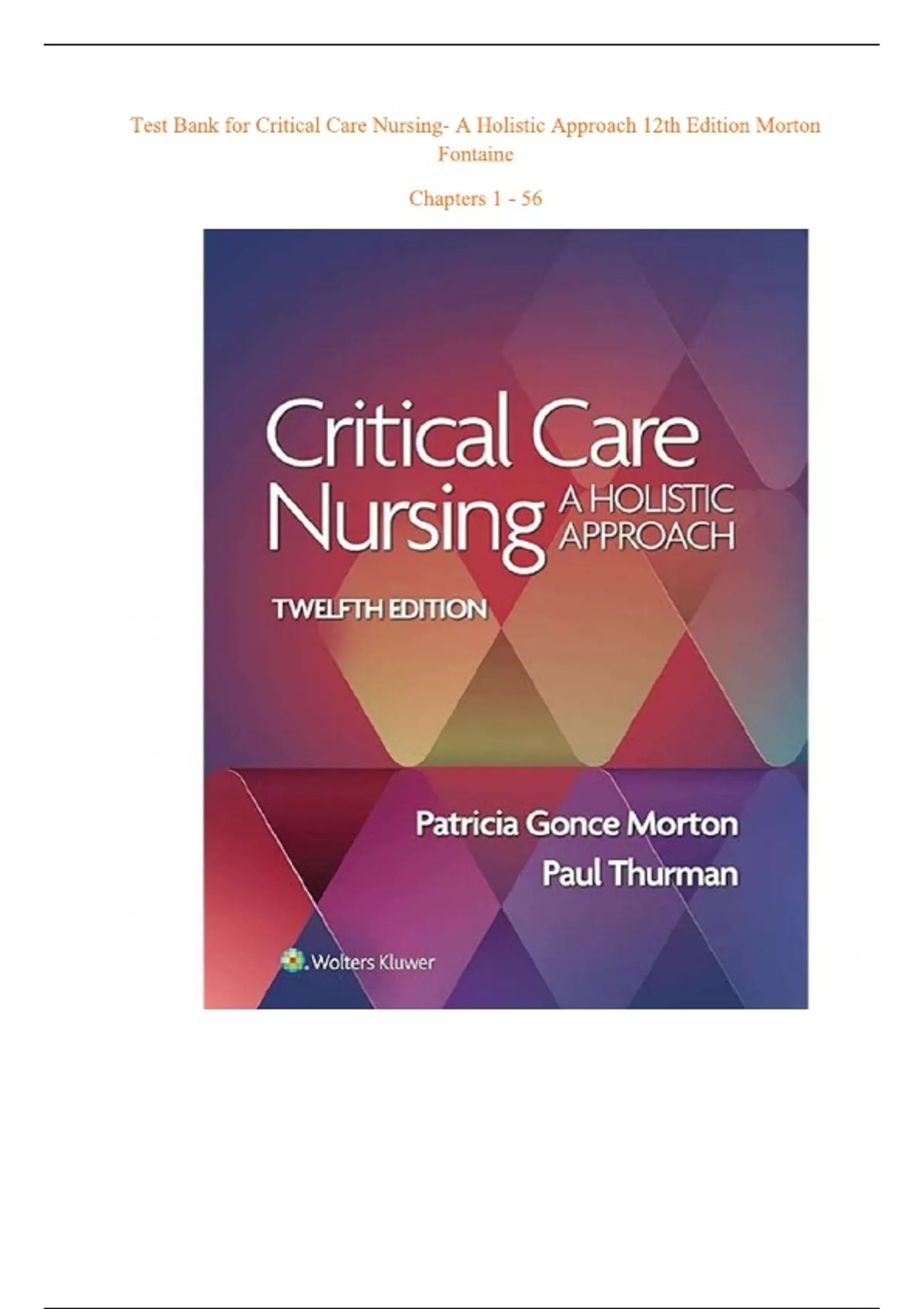 TEST BANK For Critical Care Nursing- A Holistic Approach, 12th Edition by Morton Fontaine, Verified Chapters 1 – 56-latest