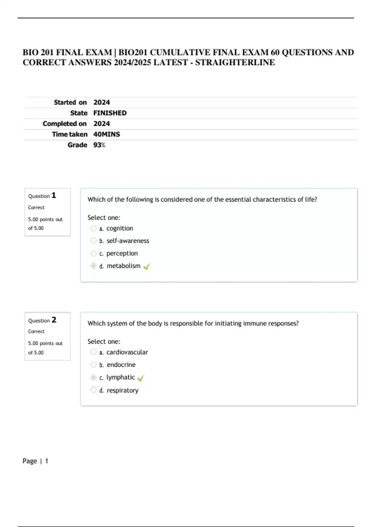 BIO 201 FINAL EXAM | BIO201 CUMULATIVE FINAL EXAM 60 QUESTIONS ANDBCORRECT ANSWERS 2024/2025 LATEST - STRAIGHTERLINE