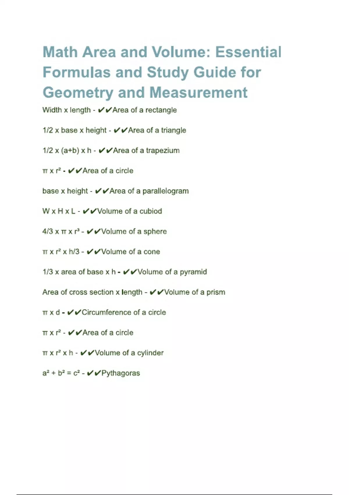 Math Area and Volume_ Essential Formulas and Study Guide for Geometry and Measurement Questions and answers