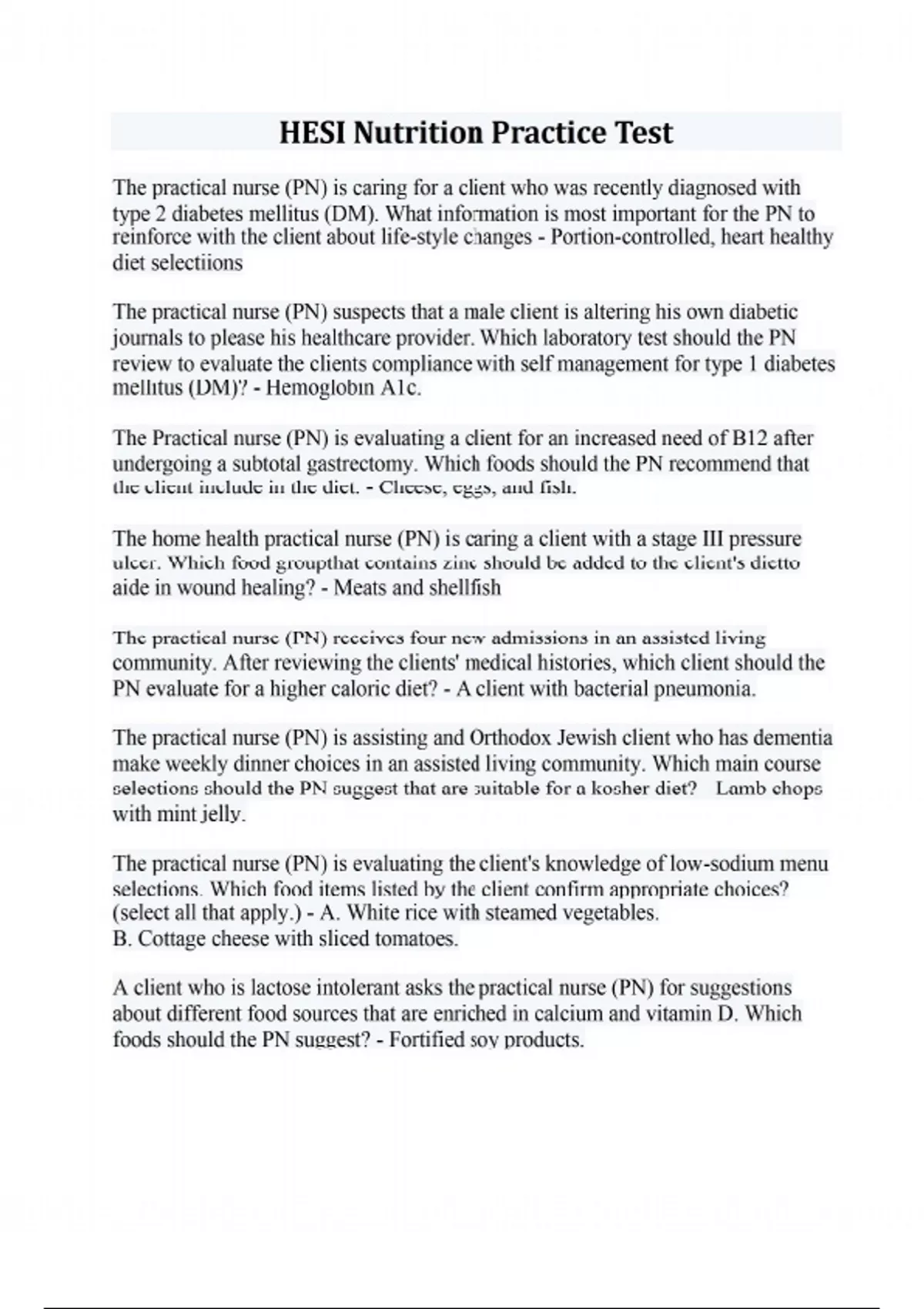 The practical nurse (PN) is caring for a client who was recently diagnosed with type 2 diabetes mellitus (DM). What information is most important for the PN to reinforce with the client about life-style changes - Portion-controlled, heart healthy diet selectiions The practical nurse (PN) suspects that a male client is altering his own diabetic journals to please his healthcare provider. Which laboratory test should the PN review to evaluate the clients compliance with self management for type 1 diabetes mellitus (DM)? - Hemoglobin A1c. The Practical nurse (PN) is evaluating a client for an increased need of B12 after undergoing a subtotal gastrectomy. Which foods should the PN recommend that the client include in the diet. - Cheese, eggs, and fish. The home health practical nurse (PN) is caring a client with a stage III pressure ulcer. Which food groupthat contains zinc should be added to the client's dietto aide in wound healing? - Meats and shellfish The practical nurse (PN) receives four new admissions in an assisted living community. After reviewing the clients' medical histories, which client should the PN evaluate for a higher caloric diet? - A client with bacterial pneumonia. The practical nurse (PN) is assisting and Orthodox Jewish client who has dementia make weekly dinner choices in an assisted living community. Which main course selections should the PN suggest that are suitable for a kosher diet? - Lamb chops with mint jelly. The practical nurse (PN) is evaluating the client's knowledge of low-sodium menu selections. Which food items listed by the client confirm appropriate choices? (select all that apply.) - A. White rice with steamed vegetables. B. Cottage cheese with sliced tomatoes. A client who is lactose intolerant asks the practical nurse (PN) for suggestions about different food sources that are enriched in calcium and vitamin D. Which foods should the PN suggest? - Fortified soy products. The practical nurse (PN) is reviewing guidelines to manage stress incontinence with a female client. Which dietary change should the PN emphasize that will benefit the client? - Avoid alcohol and caffeine. The practical nurse (PN) is reviewing the dietary recommendations with the client who had a partial gastrectomy and experienced dumping syndrome. Which statement by the client indicates that the recommendations were understood? - Fluids should be limited to eight ounces with meals. The practical nurse (PN) is reviewing a list of foods with the family that are recommended for an older client who recently had a total colectomy and colostomy. Which food item should the PN discuss about including in the client's postoperative diet? - Chicken noodle soup. The practical nurse (PN) interviews a client who had a total colectomy 2 weeks ago. The client claims to be confident in the management of the new colostomy, but is having problems managing the odor. What suggestions should the PN provide the client to help decrease odor in the colostomy bag? (select all that apply) - A. Eat foods containing yogurt. C. Drink a glass of buttermilk. D. Eat sprigs of parsley. The practical nurser (PN) reviews self-care with a male client who is newly diagnosed with cirrhosis. Which vitamin deficit due to liver damage should the PN discuss with the client that increases his susceptibility of bleeding? - Vitamin K. The practical nurse (PN) is caring for a client with continuous feeding through a nasogastric (NG) tube at a continuous care rehabilitation community. Which position should the PN place the client to prevent aspiration? - Semi-Fowler's A Chinese male client who moves into an assisted living communityis concerned that the community will not be able to meet his dietary preferences. What should the practical nurse include in the diet for this client based on his cultural group. - Vegetables. An elderly client is an assisted living community is refusing to eat during meal time. The practical nurse (PN) discovers that the client has several mouth ulcers. What types of food should the PN suggest to promote intake and healing of ulcers? - Poached or scrambled eggs A client is admitted with right upper quadrant (RUQ) pain after eating. What should the practical nurse ask the client about the meal's content that precipitated the pain? - Saturated fat content The healthcare provider prescribes an oral glucose tolerance test (GTT) for a male client with polyuria and polydypsia. The client is instructed to be NPO after midnight. What should the client be advised to drink with his morning medications? - Water without flavorings. The practical nurse (PN) is reviewing the diet with a client with acute cholecystitis. Which food selection demonstrates to the PN that the client understands dietary recommendations? - Baked fish and tomatoes with lettuce. An older client receives a prescripton for psylium (Metamucil) for constipation. What information should the practical nurse (PN) provide the client about taking this supplement? - Take supplement with 240 ml of liquid and follow with a second glass. The practical nurse (PN) is caring for a client who is receiving total parnteral which meatbolic change should the PN monitor the client for during administration for TPN - Hyperglycemia. The practical nurse (PN) reviews the dietary treatment plan with a client who has a ascities secondary to cirrhosis of the liver. Which information should the PN include when reviewing the dietary plan? - Restricted sodium intake. The practical nurse (PN) is reinforcing diet teaching for a client with a simple goiter. Which foods should the PN recommend that the client eliminate from the diet? - Turnips. A client develops a vitamin K deficiency due to intestinal malabsorption. What intervention should the practical nurse implement in the plan of care? - Monitor for signs of hematuria, melena. ecchymosis.
