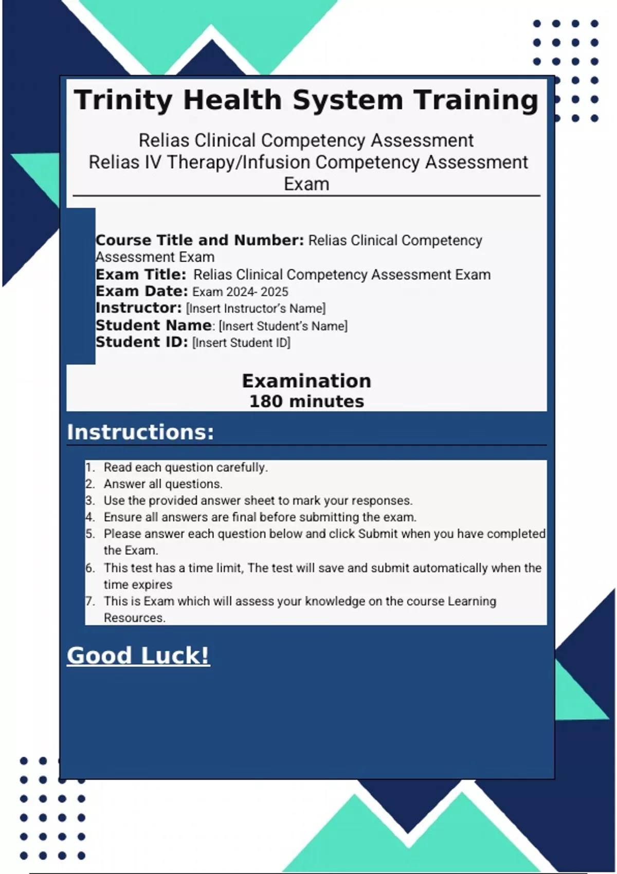 Relias IV Therapy/Infusion Competency Assessment IV Therapy/Infusion Test Bank -Med Surg Nursing: Chapter 13 Infusion Therapy Review Questions and Answers | 100% Pass Guaranteed | Graded A+ | Test Bank - Medical-Surgical Nursing: Concepts for Interprofessional Collaborative Care 9e