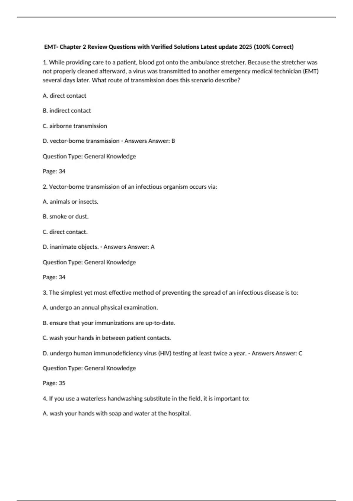 EMT- Chapter 2 Review Questions with Verified Solutions Latest update 2025 (100% Correct) 1. While providing care to a patient, blood got onto the ambulance stretcher. Because the stretcher was not properly cleaned afterward, a virus was transmitted to another emergency medical technician (EMT) several days later. What route of transmission does this scenario describe? A. direct contact B. indirect contact C. airborne transmission D. vector-borne transmission - Answers Answer: B Question Type: General Knowledge Page: 34 2. Vector-borne transmission of an infectious organism occurs via: A. animals or insects. B. smoke or dust. C. direct contact. D. inanimate objects. - Answers Answer: A Question Type: General Knowledge Page: 34 3. The simplest yet most effective method of preventing the spread of an infectious disease is to: A. undergo an annual physical examination. B. ensure that your immunizations are up-to-date. C. wash your hands in between patient contacts. D. undergo human immunodeficiency virus (HIV) testing at least twice a year. - Answers Answer: C Question Type: General Knowledge Page: 35 4. If you use a waterless handwashing substitute in the field, it is important to: A. wash your hands with soap and water at the hospital. B. immediately dry your hands with a paper towel. C. wait at least 5 minutes before touching another patient. D. avoid donning another pair of gloves for at least 10 minutes. - Answers Answer: A Question Type: General Knowledge Page: 35 5. Gloves, a mask, eye protection, and a face shield should be used: A. any time you touch non-intact skin. B. during routine cleaning of the ambulance. C. while handling needles or other sharps. D. when performing endotracheal intubation. - Answers Answer: D Question Type: General Knowledge Page: 36 6. If a mask cannot be placed on a coughing patient, the Centers for Disease Control and Prevention (CDC) recommend that you maintain a distance of at least ________ feet if possible. A. 2 B. 3 C. 4 D. 5 - Answers Answer: B Question Type: General Knowledge Page: 36 7. Prescription glasses do not provide adequate eye protection because they: A. have large rounded lenses. B. are not secured with a strap. C. offer little or no side protection. D. do not have shatterproof lenses. - Answers Answer: C Question Type: General Knowledge Page: 39 8. You are transporting a 40-year-old male with respiratory distress. The patient tells you that he recently had a positive tuberculosis (TB) skin test and is currently being evaluated for possible TB. You should: A. apply a nonrebreathing mask on the patient and a high-efficiency particulate air (HEPA) respirator on yourself. B. remain at least 3 feet away from the patient and apply a surgical mask on him. C. apply a sterile surgical mask on yourself and a HEPA respirator on the patient. D. apply a nasal cannula on the patient and a sterile surgical mask on yourself. - Answers Answer: A Question Type: Critical Thinking Page: 39 9. While assisting an advanced life support (ALS) ambulance crew, you are accidentally stuck with an IV needle. You should: A. immerse your wound in an alcohol-based solution. B. report the incident to your supervisor after the call. C. get immunized against hepatitis as soon as possible. D. discontinue patient care and seek medical attention. - Answers Answer: B Question Type: Critical Thinking Page: 40 10. The spread of HIV and hepatitis in the health care setting can usually be traced to: A. careless handling of sharps. B. a lack of proper immunizations. C. excessive blood splashing or splattering. D. a noncompliance with standard precautions. - Answers Answer: A Question Type: General Knowledge Page: 40 11. According to Occupational Safety and Health Administration (OSHA) regulations, an employer must: A. guarantee a 100% risk-free environment prior to employment. B. offer a workplace environment that reduces the risk for exposure. C. provide gloves and other personal protective equipment (PPE) to full-time paid employees only. D. screen all prospective employees for bloodborne pathogens. - Answers Answer: B Question Type: General Knowledge Page: 40 12. Determination of exposure is an important component of an infection control plan because it: A. determines the time of day that most exposures are likely to occur. B. determines which type of communicable disease might be present in the workplace. C. defines who is most likely to transmit communicable diseases in the workplace. D. defines who is at risk for contact with blood and body fluids and which tasks pose a risk of exposure. - Answers Answer: D Question Type: General Knowledge Page: 41 13. The hepatitis B vaccine program, a component of the infection control plan, addresses all of the following issues, EXCEPT: A. family history of hepatitis. B. postvaccine antibody titers. C. vaccine safety and efficacy. D. record keeping and tracking. - Answers Answer: A Question Type: General Knowledge