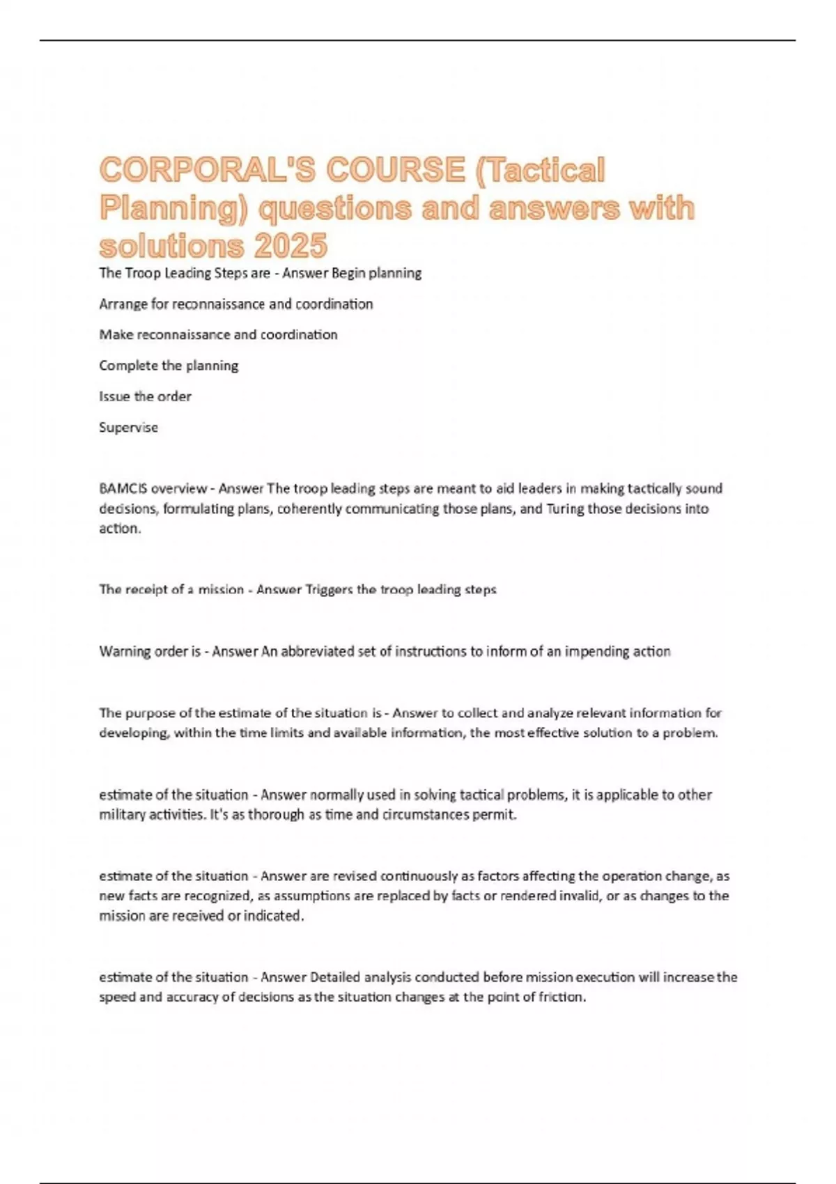 The Troop Leading Steps are - Answer Begin planning Arrange for reconnaissance and coordination Make reconnaissance and coordination Complete the planning Issue the order Supervise BAMCIS overview - Answer The troop leading steps are meant to aid leaders in making tactically sound decisions, formulating plans, coherently communicating those plans, and Turing those decisions into action. The receipt of a mission - Answer Triggers the troop leading steps Warning order is - Answer An abbreviated set of instructions to inform of an impending action The purpose of the estimate of the situation is - Answer to collect and analyze relevant information for developing, within the time limits and available information, the most effective solution to a problem. estimate of the situation - Answer normally used in solving tactical problems, it is applicable to other military activities. It's as thorough as time and circumstances permit. estimate of the situation - Answer are revised continuously as factors affecting the operation change, as new facts are recognized, as assumptions are replaced by facts or rendered invalid, or as changes to the mission are received or indicated. estimate of the situation - Answer Detailed analysis conducted before mission execution will increase the speed and accuracy of decisions as the situation changes at the point of friction. provides a logical sequence for analyzing all relevant factors - Answer METT-T analysis METT-T - Answer Mission Enemy Terrain and Weather Troops and Fire Support Time, Space and Logistics The first step in the estimate is - Answer mission analysis