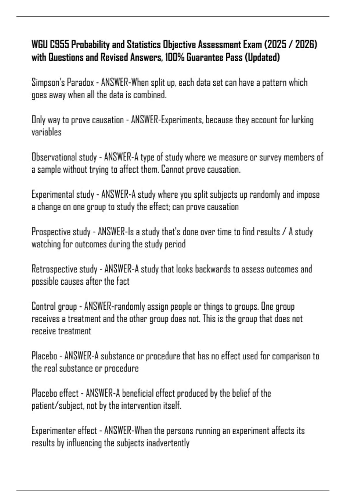 WGU C955 Probability and Statistics Objective Assessment Exam (2025 / 2026) with Questions and Revised Answers, 100% Guarantee Pass (Updated) Simpson's Paradox - ANSWER-When split up, each data set can have a pattern which goes away when all the data is combined. Only way to prove causation - ANSWER-Experiments, because they account for lurking variables Observational study - ANSWER-A type of study where we measure or survey members of a sample without trying to affect them. Cannot prove causation. Experimental study - ANSWER-A study where you split subjects up randomly and impose a change on one group to study the effect; can prove causation Prospective study - ANSWER-Is a study that's done over time to find results / A study watching for outcomes during the study period Retrospective study - ANSWER-A study that looks backwards to assess outcomes and possible causes after the fact Control group - ANSWER-randomly assign people or things to groups. One group receives a treatment and the other group does not. This is the group that does not receive treatment Placebo - ANSWER-A substance or procedure that has no effect used for comparison to the real substance or procedure Placebo effect - ANSWER-A beneficial effect produced by the belief of the patient/subject, not by the intervention itself. Experimenter effect - ANSWER-When the persons running an experiment affects its results by influencing the subjects inadvertently
