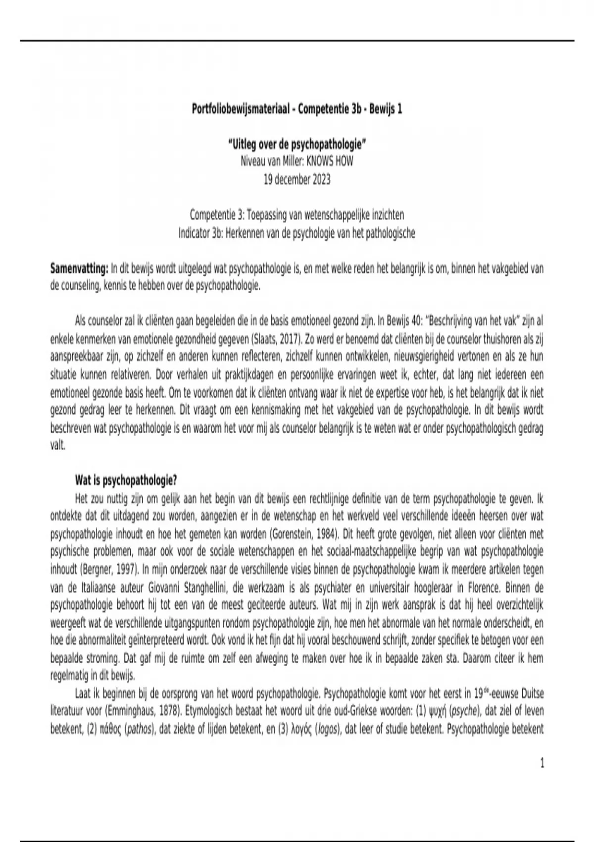 Dit document bevat Bewijs 1 'Uitleg over de psychopathologie' van competentie 3b 'Herkennen van de psychologie van het pathologische'. Dit bewijs is uitstekend beoordeeld door de docent.