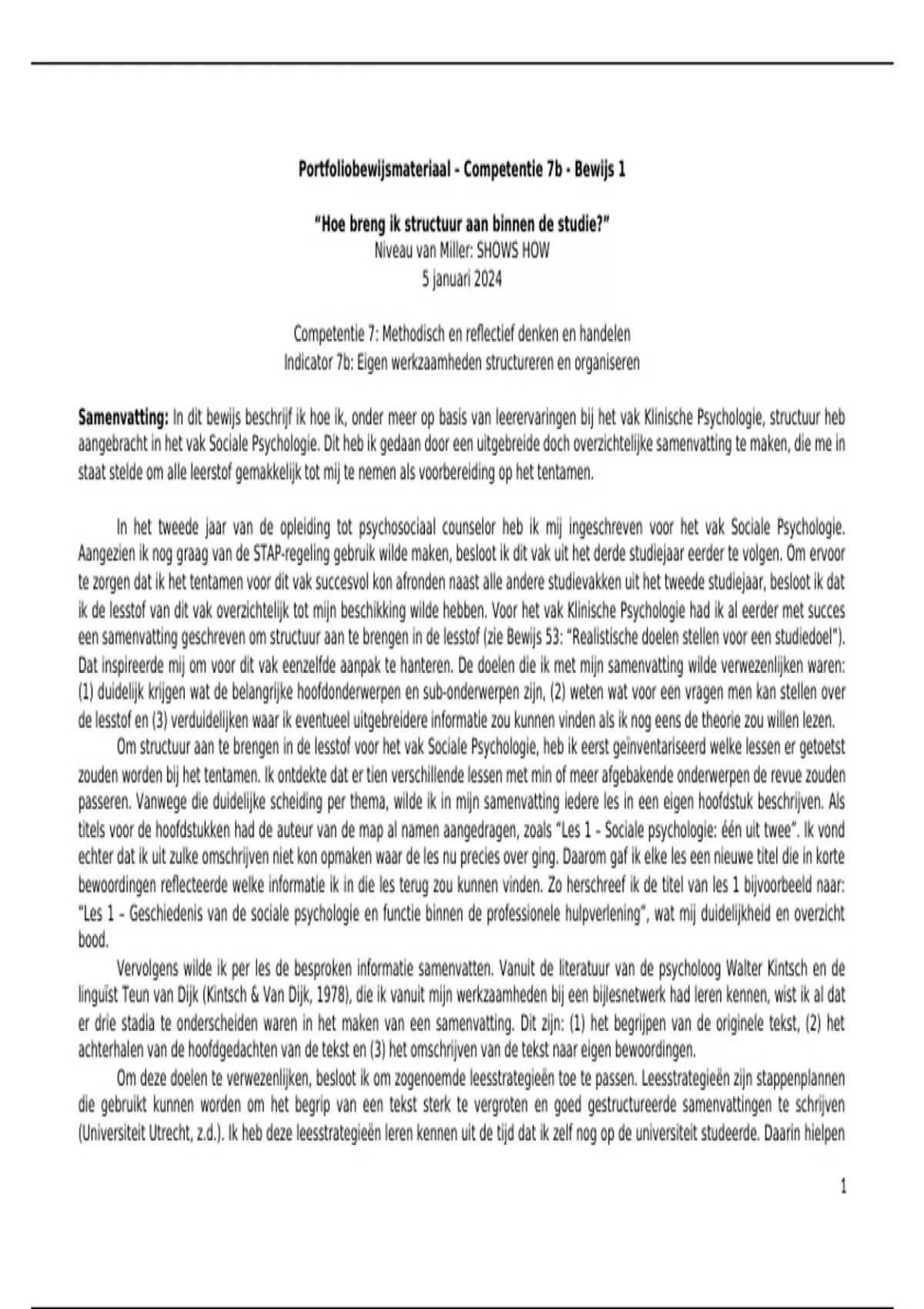 Dit document bevat Bewijs 1 'Hoe breng ik structuur aan binnen de studie?' van competentie 7b 'Eigen werkzaamheden structureren en organiseren'. Dit bewijs is uitstekend beoordeeld door de docent.