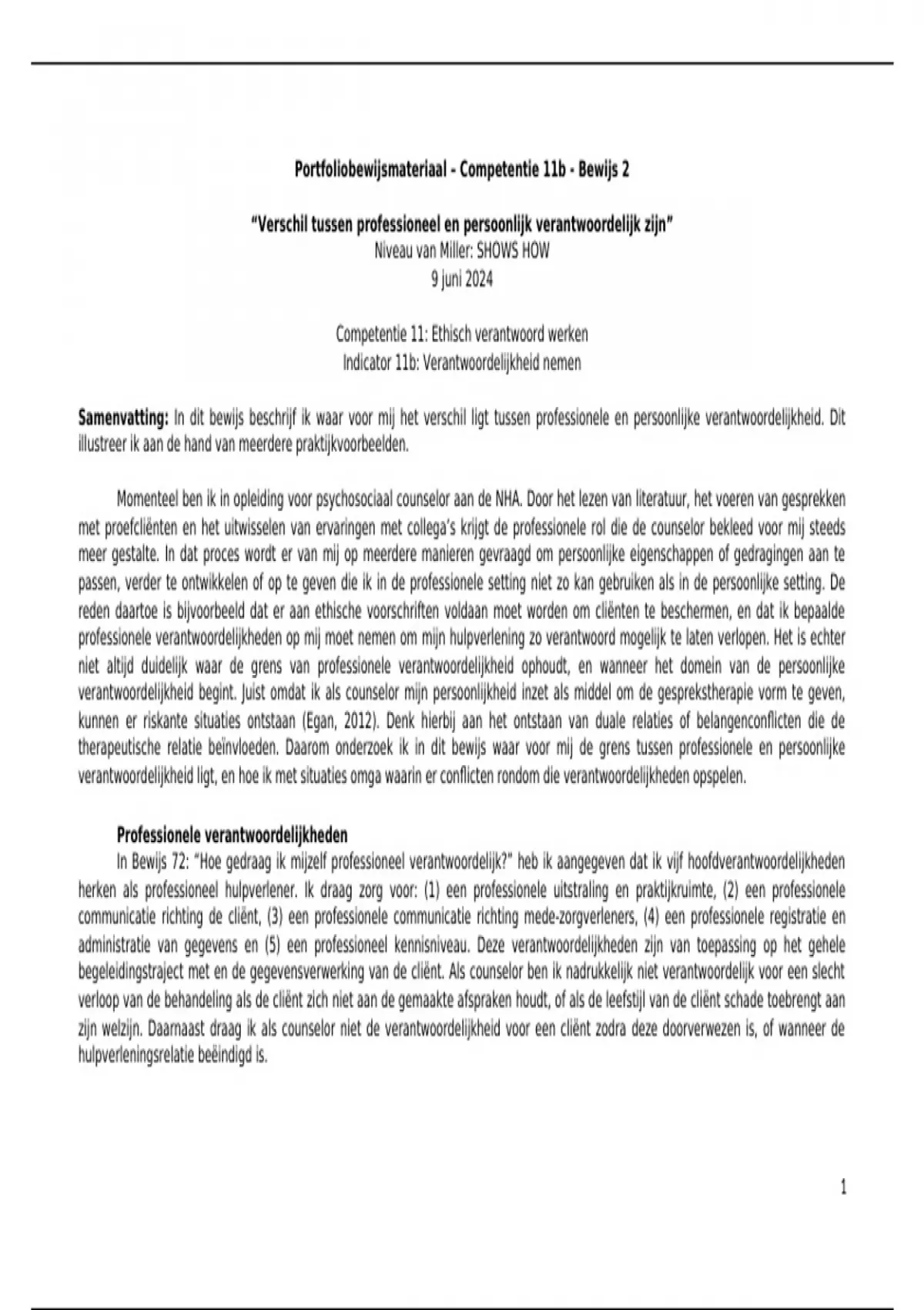 Samenvatting: In dit bewijs beschrijf ik waar voor mij het verschil ligt tussen professionele en persoonlijke verantwoordelijkheid. Dit