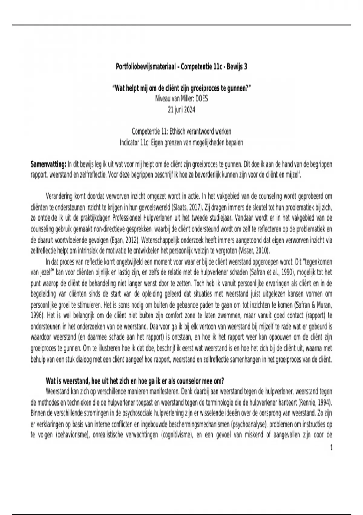 rapport, weerstand en zelfreflectie. Voor deze begrippen beschrijf ik hoe ze bevorderlijk kunnen zijn voor de cliënt en mijzelf.
