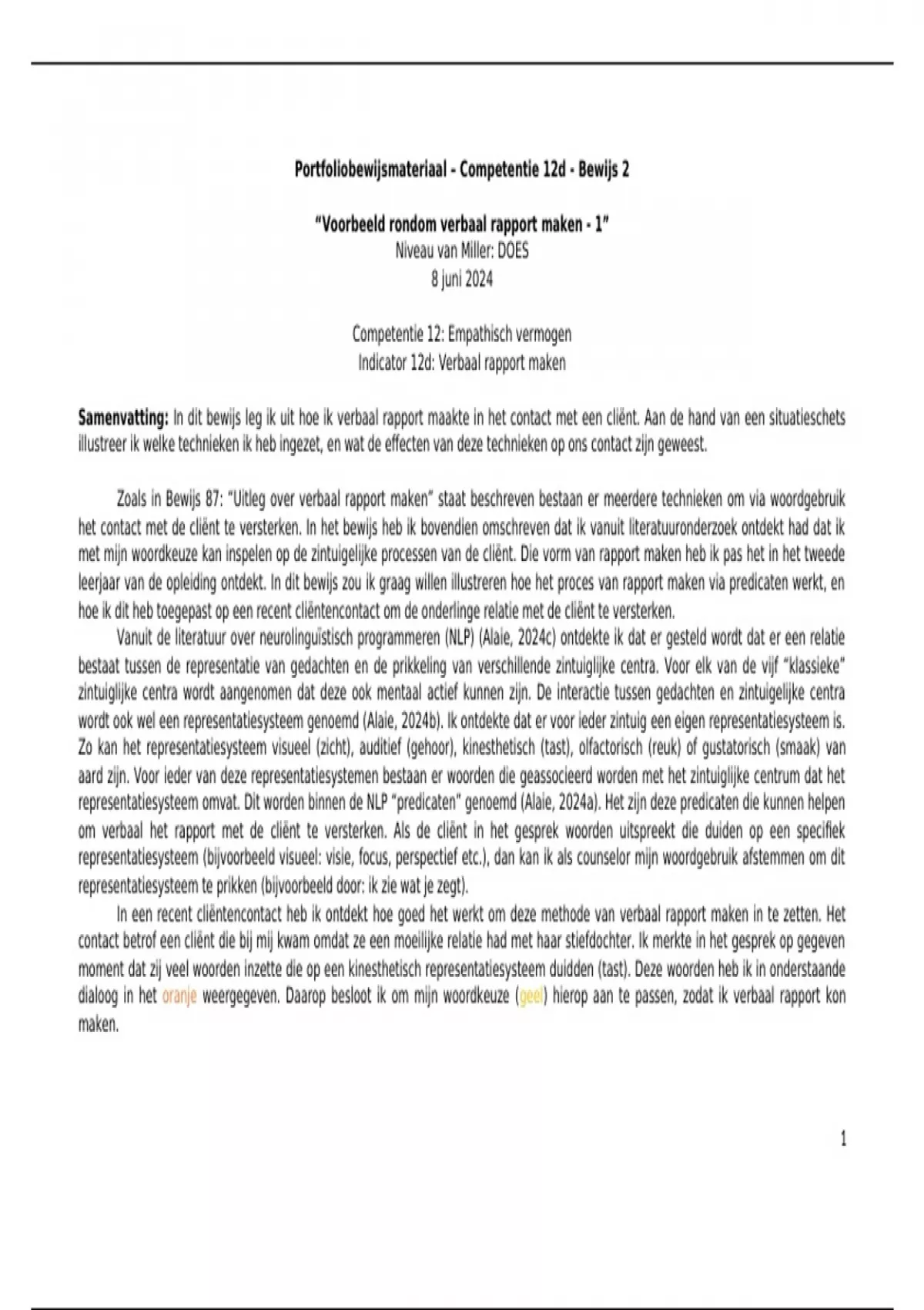 Samenvatting: In dit bewijs leg ik uit hoe ik verbaal rapport maakte in het contact met een cliënt. Aan de hand van een situatieschets