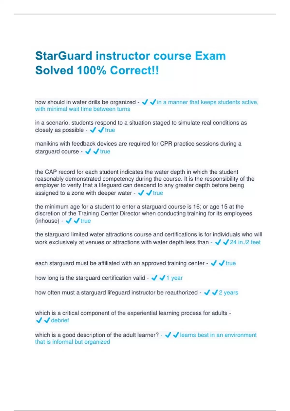 how should in water drills be organized - ️️in a manner that keeps students active, with minimal wait time between turns in a scenario, students respond to a situation staged to simulate real conditions as closely as possible - ️️true manikins with feedback devices are required for CPR practice sessions during a starguard course - ️️true the CAP record for each student indicates the water depth in which the student reasonably demonstrated competency during the course. It is the responsibility of the employer to verify that a lifeguard can descend to any greater depth before being assigned to a zone with deeper water - ️️true the minimum age for a student to enter a starguard course is 16; or age 15 at the discretion of the Training Center Director when conducting training for its employees (inhouse) - ️️true the starguard limited water attractions course and certifications is for individuals who will work exclusively at venues or attractions with water depth less than - ️️24 in./2 feet each starguard must be affiliated with an approved training
