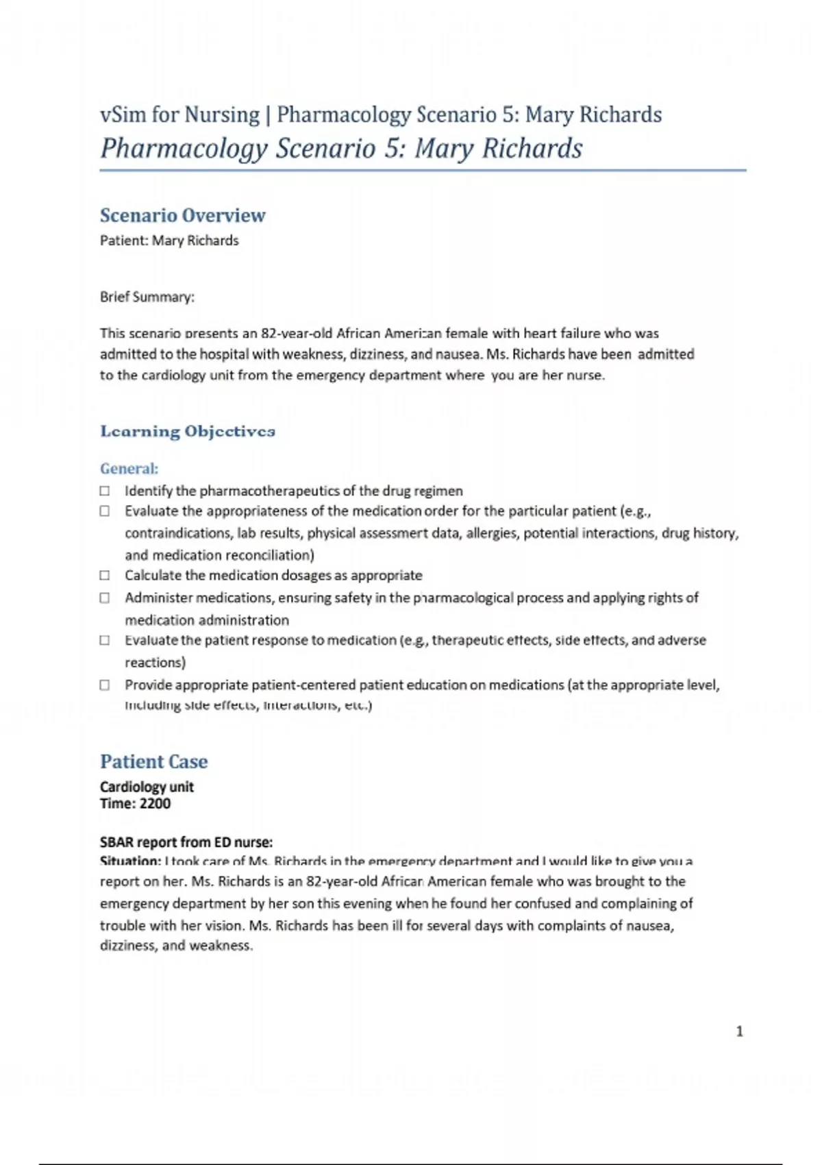 Scenario Overview Patient: Mary Richards Brief Summary: This scenario presents an 82-year-old African American female with heart failure who was admitted to the hospital with weakness, dizziness, and nausea. Ms. Richards have been admitted to the cardiology unit from the emergency department where you are her nurse. Learning Objectives General: □ Identify the pharmacotherapeutics of the drug regimen □ Evaluate the appropriateness of the medication order for the particular patient (e.g., contraindications, lab results, physical assessment data, allergies, potential interactions, drug history, and medication reconciliation) □ Calculate the medication dosages as appropriate □ Administer medications, ensuring safety in the pharmacological process and applying rights of medication administration □ Evaluate the patient response to medication (e.g., therapeutic effects, side effects, and adverse reactions) □ Provide appropriate patient-centered patient education on medications (at the appropriate level, including side effects, interactions, etc.)