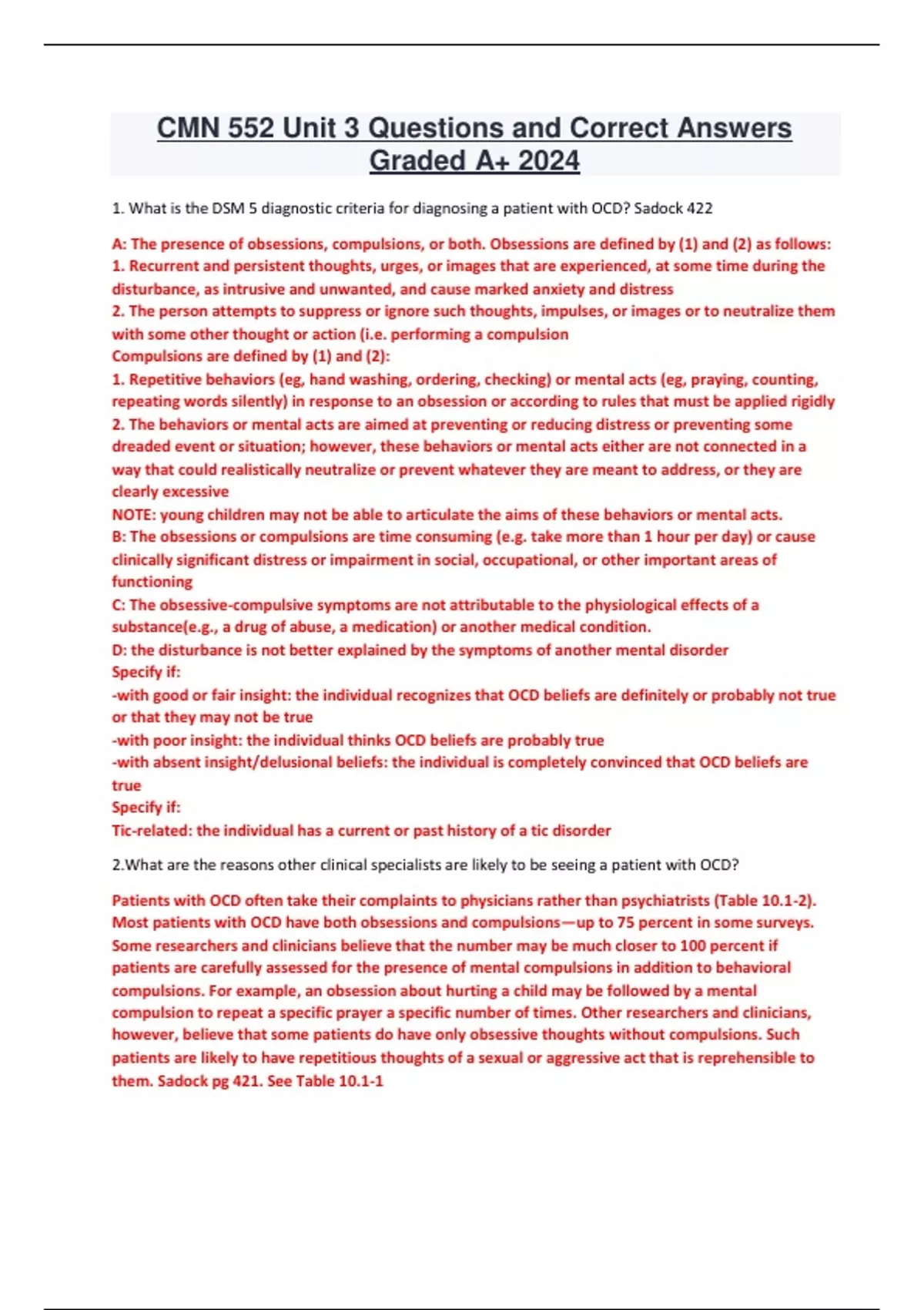 CMN 552 Unit 3 Questions and Correct Answers Graded A+ 2024 1. What is the DSM 5 diagnostic criteria for diagnosing a patient with OCD? Sadock 422 A: The presence of obsessions, compulsions, or both. Obsessions are defined by (1) and (2) as follows: 1. Recurrent and persistent thoughts, urges, or images that are experienced, at some time during the disturbance, as intrusive and unwanted, and cause marked anxiety and distress 2. The person attempts to suppress or ignore such thoughts, impulses, or images or to neutralize them with some other thought or action (i.e. performing a compulsion Compulsions are defined by (1) and (2): 1. Repetitive behaviors (eg, hand washing, ordering, checking) or mental acts (eg, praying, counting, repeating words silently) in response to an obsession or according to rules that must be applied rigidly 2. The behaviors or mental acts are aimed at preventing or reducing distress or preventing some dreaded event or situation; however, these behaviors or mental acts either are not connected in a way that could realistically neutralize or prevent whatever they are meant to address, or they are clearly excessive NOTE: young children may not be able to articulate the aims of these behaviors or mental acts. B: The obsessions or compulsions are time consuming (e.g. take more than 1 hour per day) or cause clinically significant distress or impairment in social, occupational, or other important areas of functioning C: The obsessive-compulsive symptoms are not attributable to the physiological effects of a substance(e.g., a drug of abuse, a medication) or another medical condition. D: the disturbance is not better explained by the symptoms of another mental disorder Specify if: -with good or fair insight: the individual recognizes that OCD beliefs are definitely or probably not true or that they may not be true -with poor insight: the individual thinks OCD beliefs are probably true -with absent insight/delusional beliefs: the individual is completely convinced that OCD beliefs are true Specify if: Tic-related: the individual has a current or past history of a tic disorder 2.What are the reasons other clinical specialists are likely to be seeing a patient with OCD? Patients with OCD often take their complaints to physicians rather than psychiatrists (Table 10.1-2). Most patients with OCD have both obsessions and compulsions—up to 75 percent in some surveys. Some researchers and clinicians believe that the number may be much closer to 100 percent if patients are carefully assessed for the presence of mental compulsions in addition to behavioral compulsions. For example, an obsession about hurting a child may be followed by a mental compulsion to repeat a specific prayer a specific number of times. Other researchers and clinicians, however, believe that some patients do have only obsessive thoughts without compulsions. Such patients are likely to have repetitious thoughts of a sexual or aggressive act that is reprehensible to them. Sadock pg 421. See Table 10.1-1 3.What would the psychiatric nurse practitioner consider as differential diagnosis when evaluating a patient for OCD? Tourette's Disorder 4.What is the best way to distinguish between OCD and major depressive disorder? Sadock pg 418 Obsessive compulsive disorder ( OCD) is represented by a diverse group of symptoms that include intrusive thoughts, rituals, preoccupations,and compulsions. These recurrent obsessions or compulsion cause severe distress to the person. The obsessions or compulsions are time consuming and interfere significantly with the person's normal routine, occupational functioning , usual social activities, or relationships. A patient with OCD may have an obsessive, a compulsion, or both. Sadock pg 347. A major depressive disorder occurs without a history of a manic,mixed ,or hypomanic episode. A major depressive episode must last at least 2 weeks , and typically a person with a diagnosis of a major depressive episode also experiences at least four symptoms from a list that includes changes in appetite and weight , changes in sleep and activity ,lack of energy , feelings of guilt , problems thinking and making decisions, and recurring thoughts of suicide. 5.Review the pharmacotherapy treatment options for OCD. Sadock, pp. 424-425. The standard approach is to start treatment with an SSRI or clomipramine and then to move to other pharmacological strategies if the serotonin-specific drugs are not effective. The serotonergic drugs have increased the percentage of patients with OCD who are likely to respond to treatment to the range of 50 to 70 percent. Each of the SSRIs available in the United States has been approved by the FDA for the treatment of OCD. Higher dosages have often been necessary for a beneficial effect, such as 80 mg a day of fluoxetine. SSRI side effects are generally less troubling than the adverse effects associated with tricyclic drugs such as clomipramine. Clomipramine: The most selective for serotonin reuptake versus norepinephrine reuptake and is exceeded in this respect only by the SSRIs. The potency of serotonin reuptake of clomipramine is exceeded only by sertraline and paroxetine. Its dosing must be titrated upward over 2 to 3 weeks to avoid gastrointestinal adverse effects and orthostatic hypotension, and as with other tricyclic drugs, it causes significant sedation and anticholinergic effects, including dry mouth and constipation. As with SSRIs, the best outcomes result from a combination of drug and behavioral therapy. Other drugs: Augment the first drug by the addition of valproate, lithium, or carbamazepine. Other drugs that can be tried in the treatment of OCD are venlafaxine, pindolol, and the monoamine oxidase inhibitors, especially phenelzine (Nardil). Other pharmacological agents for the treatment of unresponsive patients include Buspar, 5-hydroxytryptamine (5-HT), L-tryptophan, and clonazepam. Adding an atypical antipsychotic such as risperidone has helped in some