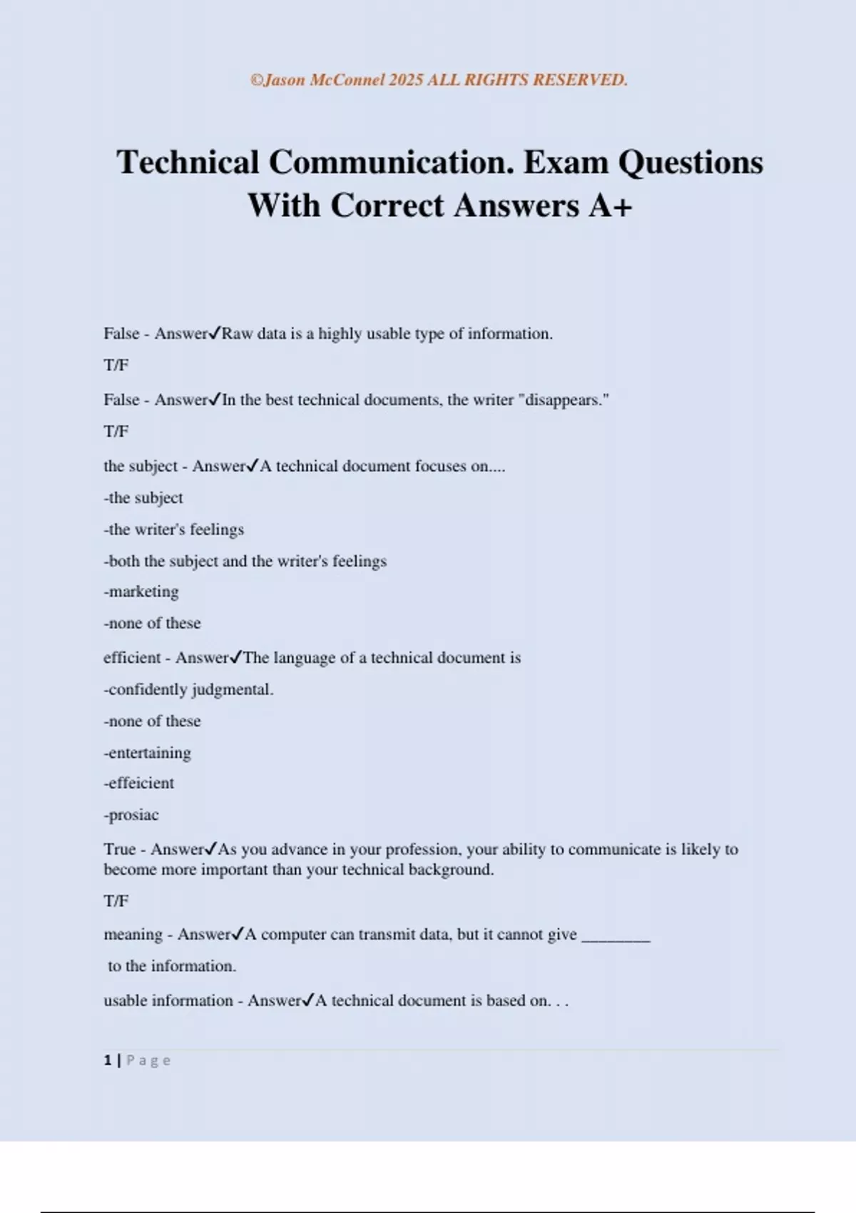 Technical Communication. Exam Questions With Correct Answers A+ False - AnswerRaw data is a highly usable type of information. T/F False - AnswerIn the best technical documents, the writer "disappears." T/F the subject - AnswerA technical document focuses on.... -the subject -the writer's feelings -both the subject and the writer's feelings -marketing -none of these efficient - AnswerThe language of a technical document is -confidently judgmental. -none of these -entertaining -effeicient -prosiac True - AnswerAs you advance in your profession, your ability to communicate is likely to become more important than your technical background. T/F meaning - AnswerA computer can transmit data, but it cannot give ________ to the information. usable information - AnswerA technical document is based on. . . ©Jason McConnel 2025 ALL RIGHTS RESERVED. 2 | P a g e -usable information -inspiration -the writer's deepest impressions -intuition -none of these False - AnswerEffective communicators "let the data speak for themselves." T/F False - AnswerDirect, straightforward communication is valued by all cultures. T/F communication - AnswerExecutives consistently rank ________ skills as the most vital of employee qualities. middle - AnswerFor best emphasis, avoid placing the key word or phrase at the sentence's. . . -terminal -end -beginning -middle False - AnswerWhenever possible, you should preface your assertions with "I think," "In my opinion," "I believe," or some other qualifier. T/F fluent - AnswerIn its style, an efficient sentence is clear, concise, and. . . -informative 0short -fluent -entertaining -mellifluous False - AnswerThe passive voice is usually more forceful and direct than the active voice. T/F Independent - AnswerWhen combining sentences, place the idea that deserves most emphasis in a clause that is. . .