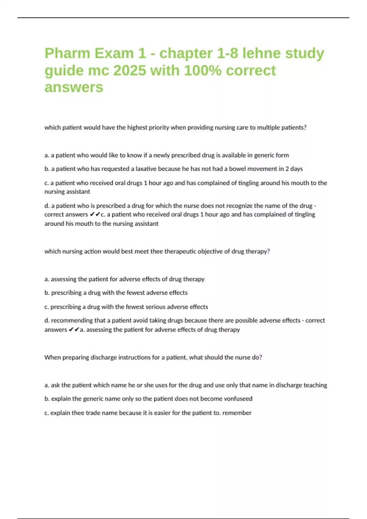 which patient would have the highest priority when providing nursing care to multiple patients? a. a patient who would like to know if a newly prescribed drug is available in generic form b. a patient who has requested a laxative because he has not had a bowel movement in 2 days c. a patient who received oral drugs 1 hour ago and has complained of tingling around his mouth to the nursing assistant d. a patient who is prescribed a drug for which the nurse does not recognize the name of the drug - correct answers c. a patient who received oral drugs 1 hour ago and has complained of tingling around his mouth to the nursing assistant which nursing action would best meet thee therapeutic objective of drug therapy? a. assessing the patient for adverse effects of drug therapy b. prescribing a drug with the fewest adverse effects c. prescribing a drug with the fewest serious adverse effects d. recommending that a patient avoid taking drugs because there are possible adverse effects - correct answers a. assessing the patient for adverse effects of drug therapy When preparing discharge instructions for a patient, what should the nurse do? a. ask the patient which name he or she uses for the drug and use only that name in discharge teaching b. explain the generic name only so the patient does not become vonfuseed c. explain thee trade name because it is easier for the patient to. remember