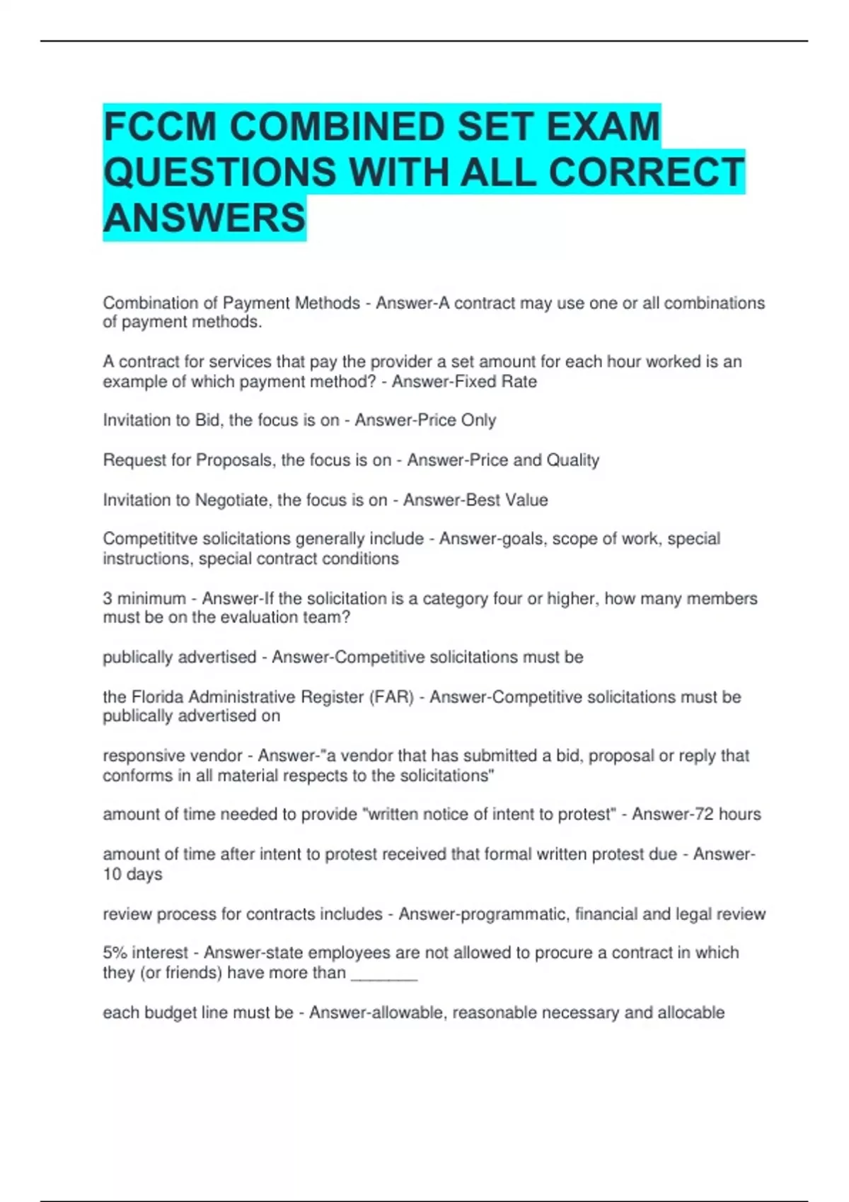 FCCM COMBINED SET EXAM QUESTIONS WITH ALL CORRECT ANSWERS Combination of Payment Methods - Answer-A contract may use one or all combinations of payment methods. A contract for services that pay the provider a set amount for each hour worked is an example of which payment method? - Answer-Fixed Rate Invitation to Bid, the focus is on - Answer-Price Only Request for Proposals, the focus is on - Answer-Price and Quality Invitation to Negotiate, the focus is on - Answer-Best Value Competititve solicitations generally include - Answer-goals, scope of work, special instructions, special contract conditions 3 minimum - Answer-If the solicitation is a category four or higher, how many members must be on the evaluation team? publically advertised - Answer-Competitive solicitations must be the Florida Administrative Register (FAR) - Answer-Competitive solicitations must be publically advertised on responsive vendor - Answer-"a vendor that has submitted a bid, proposal or reply that conforms in all material respects to the solicitations" amount of time needed to provide "written notice of intent to protest" - Answer-72 hours amount of time after intent to protest received that formal written protest due - Answer-10 days review process for contracts includes - Answer-programmatic, financial and legal review 5% interest - Answer-state employees are not allowed to procure a contract in which they (or friends) have more than _______ each budget line must be - Answer-allowable, reasonable necessary and allocable noncompetitive agreements - Answer-cost analysis is legally required for _____ agreements with recipiients or cost reimbursement agreements - Answer-cost analysis is best practice for _____ sources of authority for state funds - Answer-florida statutes, florida administrative code, CFO memos, reference guide for state expenditures, catalog of state financial assistance sources of authority for federal funds - Answer-catalog of federal domestic assistance, 2 CFR part 200 allocation - Answer-how much time are employees working on this program? deliverables, financial consequences, scope of work - Answer-required in contract deliverables should be - Answer-quantifiable, measurable and verifiable quarterly/quarterly, monthly/monthly - Answer-performance expectation should correspond with payment schedule 35k - Answer-financial consequences are required for awards greater than contract manager responsibilities - Answer-managing receipt of services, monitoring/evaluating provider performance & user satisfaction, serving as liaison with provider, cost reconciliation (grants) important contract manager responsibility - Answer-maintaining contract management file & providing written certification that services were completed how long to have things uploaded to FACTS? - Answer-30 days can you add additional requirmenta to contract in after contract meeting - Answer-no after contract... - Answer-at the meeting provide a list of actjon items and responsible parties Complaint to Vendor list - Answer-bad but removable PUR 9999 Notice of Default - Answer-worst list; must be on for 3 years, must pay for cost of vendor replacement five - Answer-XXXX workind days to observe supplies and materials before payment is made 20 - Answer-XXXX days to process invoices liquidated damages, settlement agreements - Answer-not required on contract retroactive - Answer-amendments cannot be 3 years or length of contract, whichever is longer - Answer-renewals can be up to single source or emergency - Answer-renewals cannot be made on contracts that are before expiration date of original contract - Answer-renewals must be done evidence of satisfactory performance - Answer-to process a rewnewal you must provide six months max - Answer-extensions are for same terms and conditions as original - Answer-extensions must have one (outside of events "beyond control," i.e., the government's fault) - Answer-how many extensions are allowed? mergers or buyouts - Answer-when are assignments used? Chapter 112 (Part iii) Florida Statutes - Answer-Code of Ethics or Public Officers and Employees $20k - Answer-Category 1 $35k - Answer-Category 2 $65k - Answer-Category 3 $195k - Answer-Category 4 $325k - Answer-Category 5 Florida Certified Contract Negotiator - Answer-if the contract is greater than $ 1 million in a fiscal year, you need XXXXX to negotiate $ 1 million - Answer-if the contract is greater than XXXXXX in a fiscal year, you need Florida Certified Contract Negotiator to negotiate $ 10 million - Answer-if the contract is greater than XXXXXX in a fiscal year, you need Certified Project Management Professional to negotiate