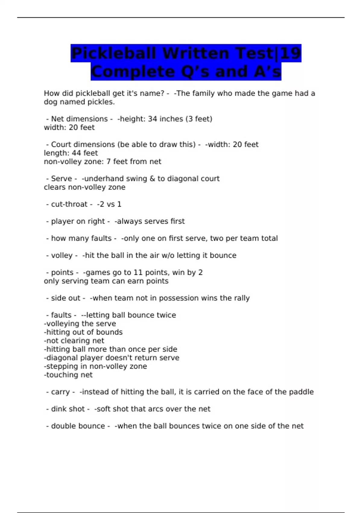 Pickleball Written Test|19 Complete Q’s and A’s