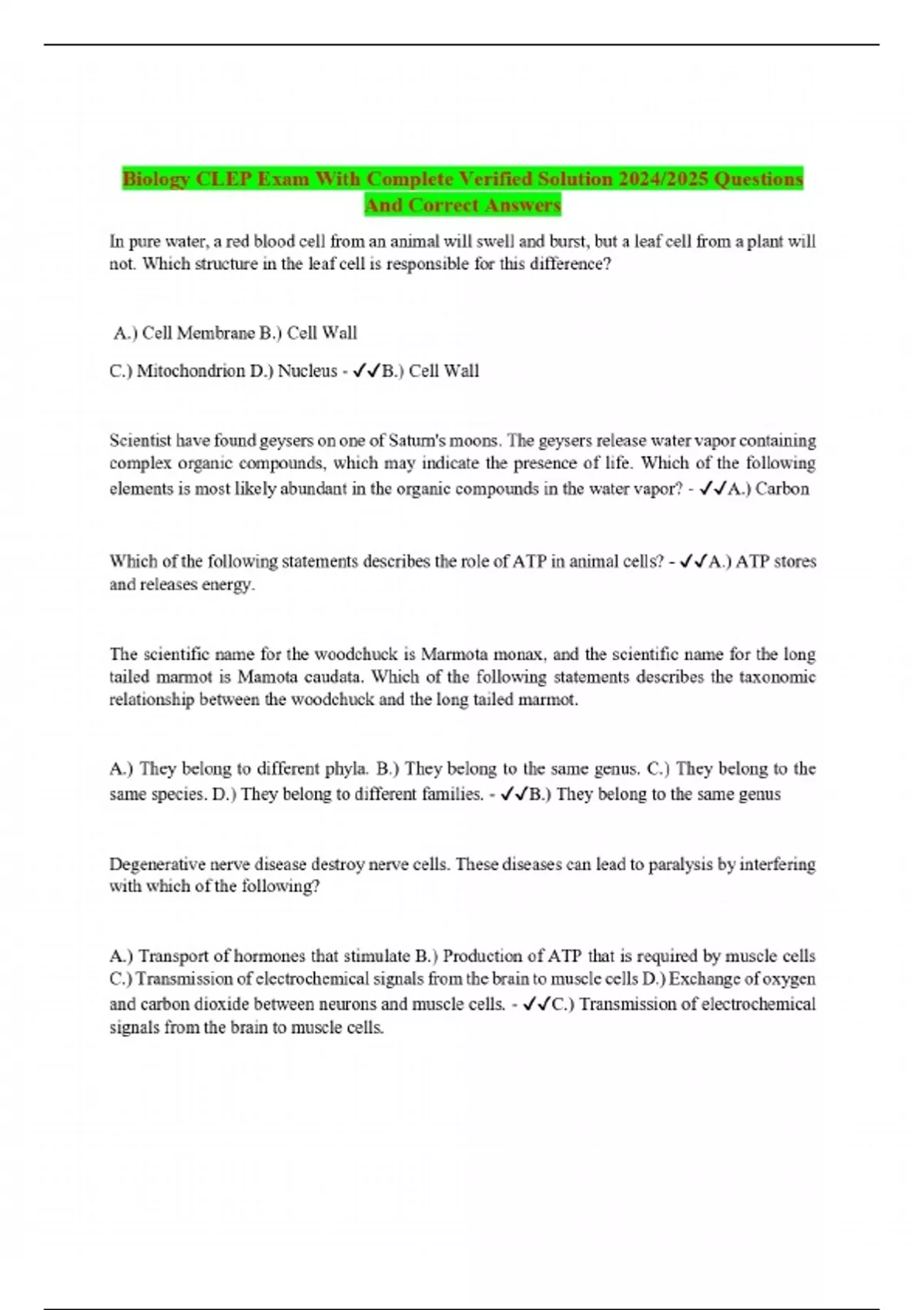 Biology CLEP Exam With Complete Verified Solution 2024/2025 Questions And Correct Answers