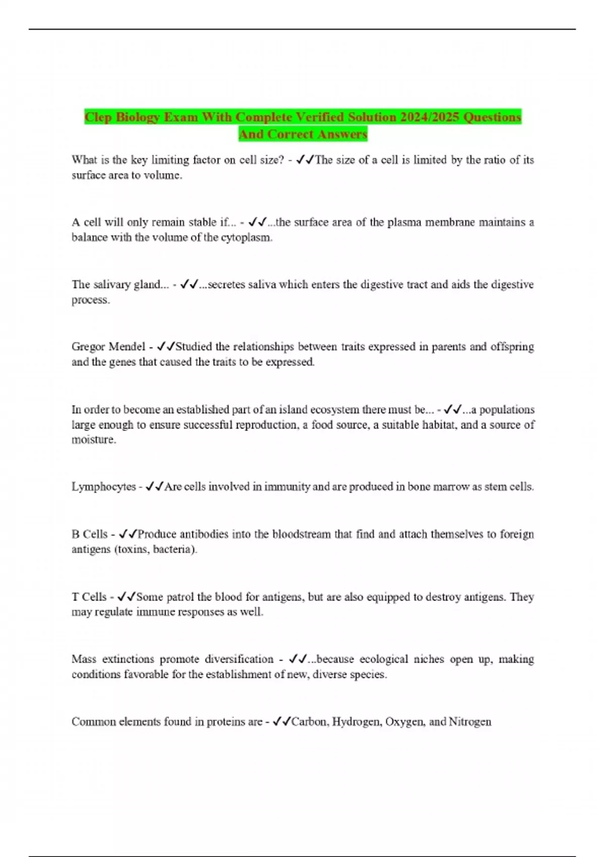 Clep Biology Exam With Complete Verified Solution 2024/2025 Questions And Correct Answers