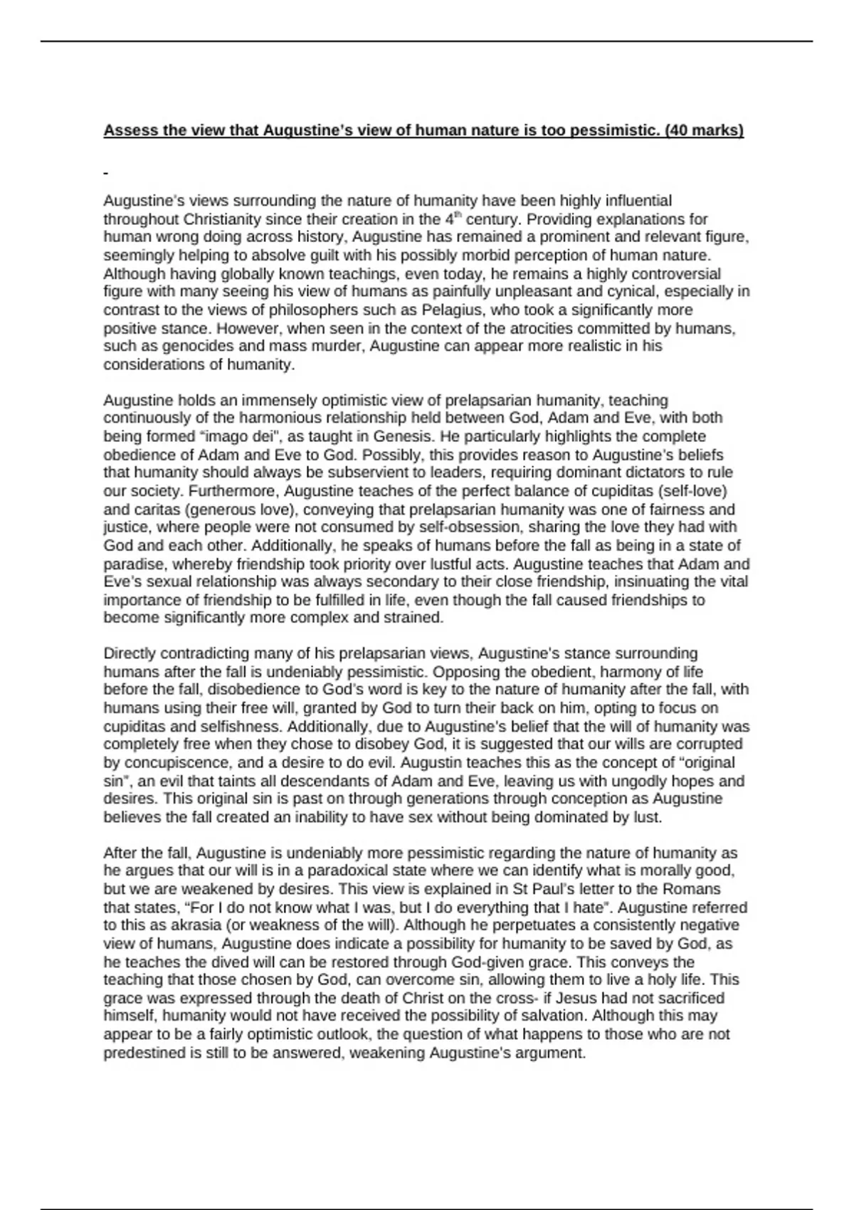 Assess the view that Augustine’s view of human nature is too pessimistic. (40 marks)