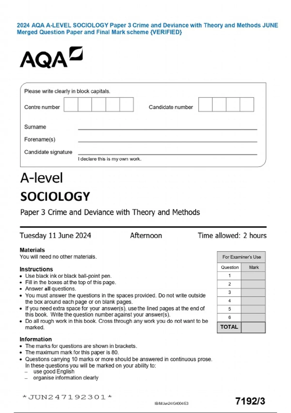 2024 AQA A-LEVEL SOCIOLOGY Paper 3 Crime and Deviance with Theory and Methods JUNE Merged Question Paper and Final Mark scheme {VERIFIED}