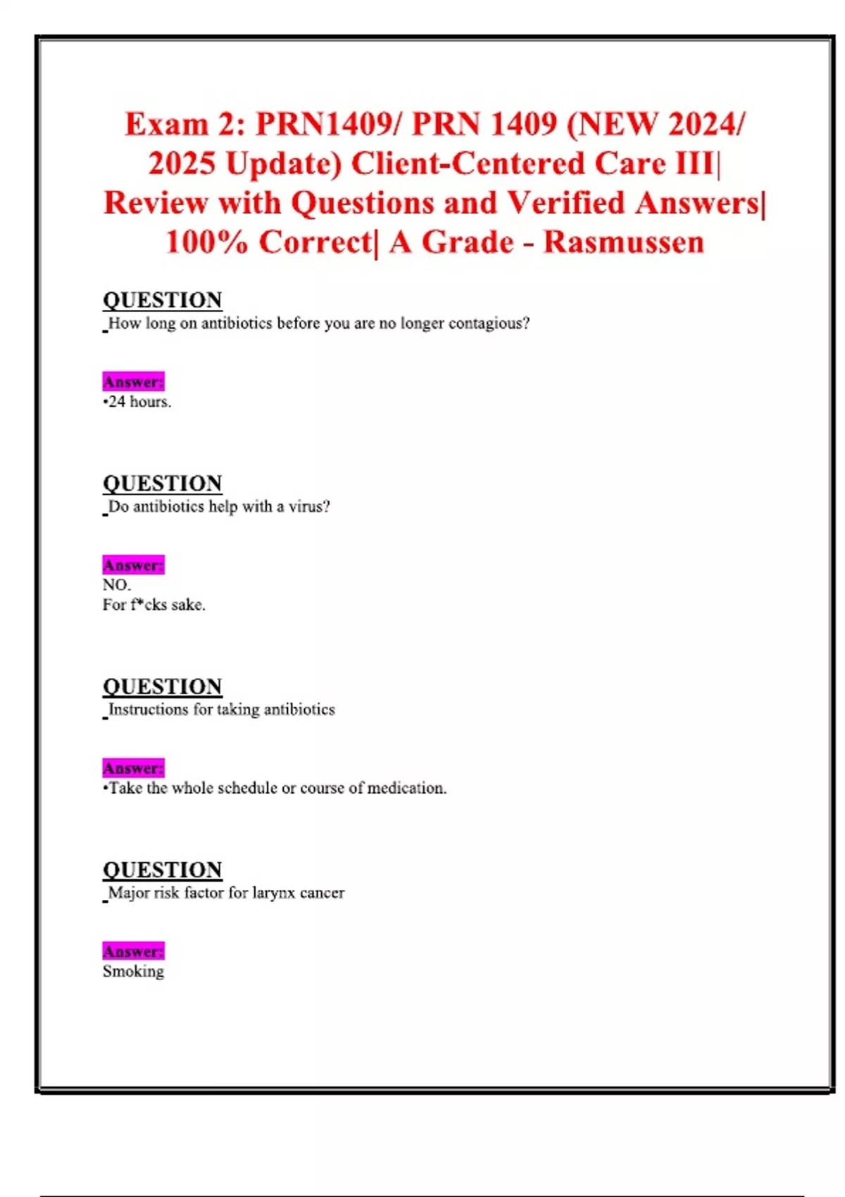 Exam 2: PRN1409 / PRN 1409 (Latest 2024 / 2025 Update) Client-Centered Care III Review | Questions and Verified Answers | 100% Correct | Grade A
