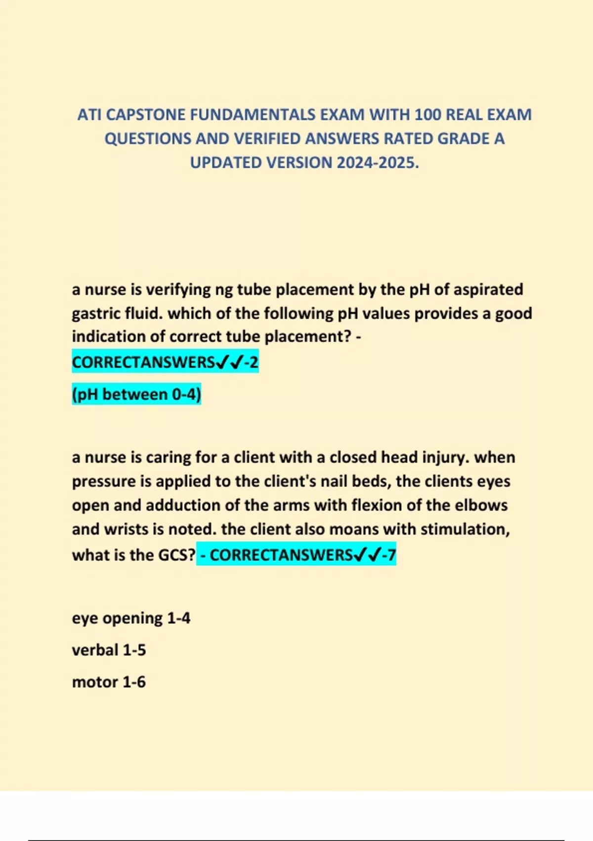 ATI CAPSTONE FUNDAMENTALS EXAM WITH 100 REAL EXAM QUESTIONS AND VERIFIED ANSWERS RATED GRADE A UPDATED VERSION .