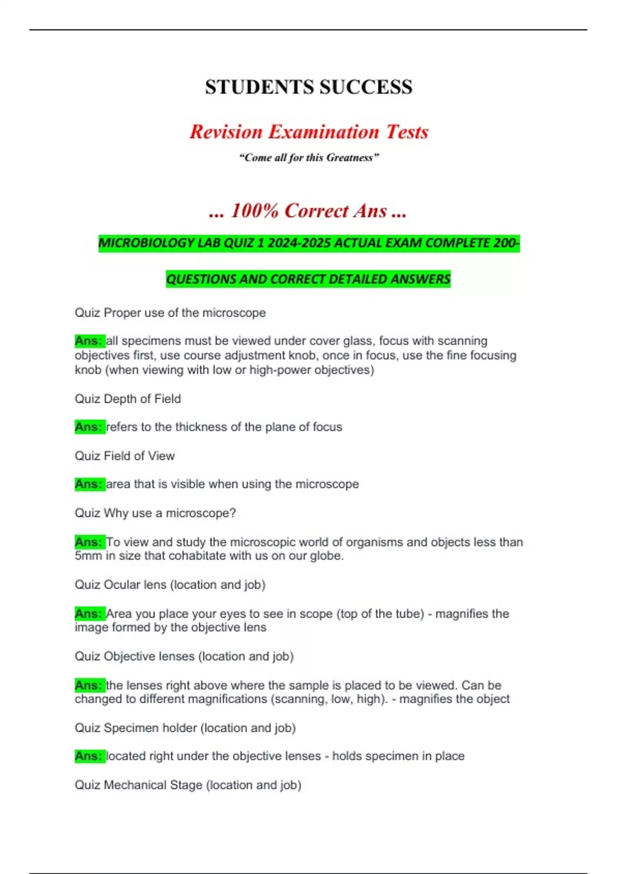 MICROBIOLOGY LAB QUIZ 1 2024-2025 ACTUAL EXAM COMPLETE 200-